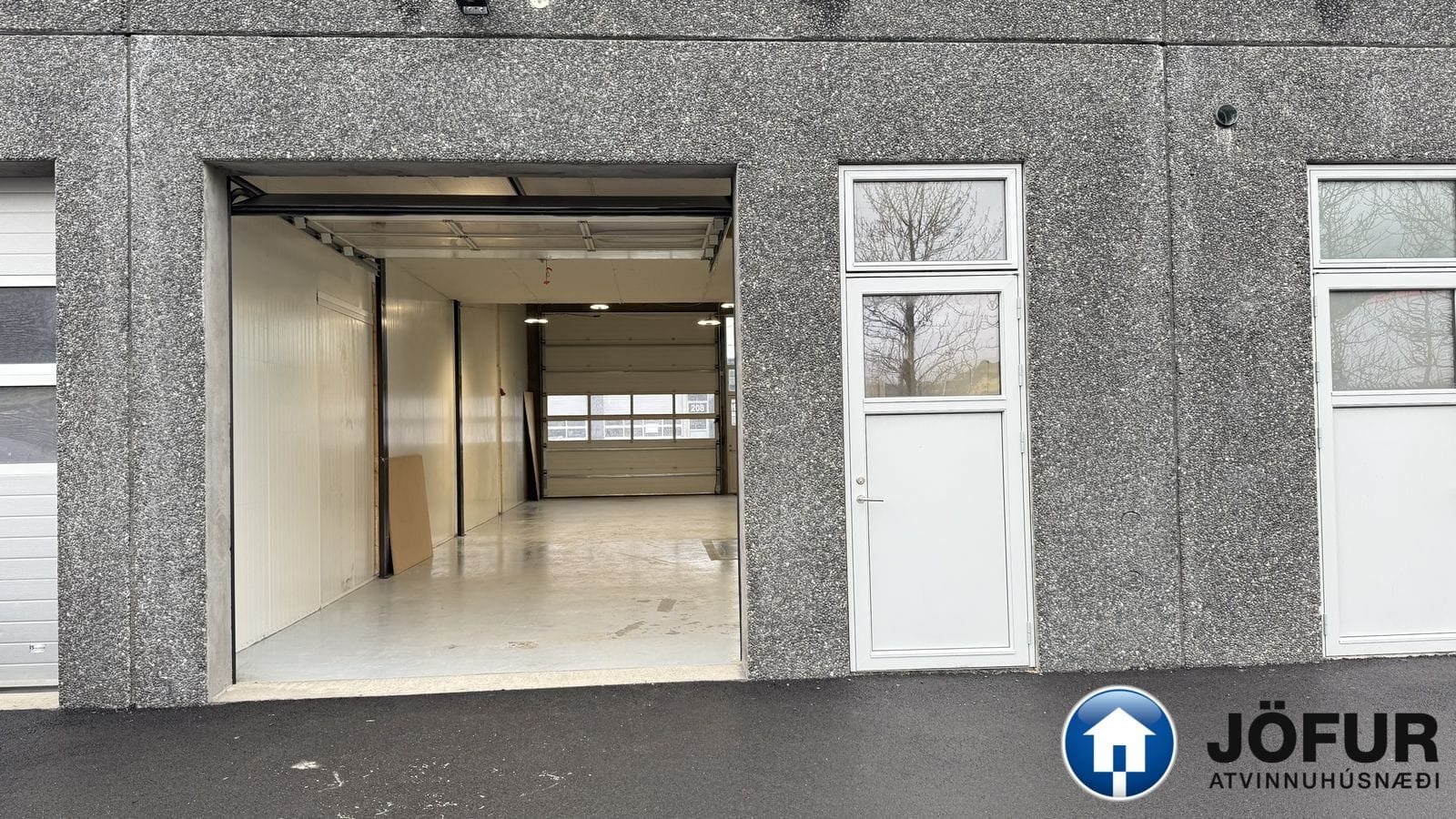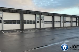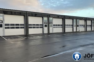 Nánari lýsing:Húsið eru frágengið að utan, bæði þak og veggir ásamt þakrennum og niðurföllum. Innkeyrsluhurðir með rafmagnsopnun, tvær á framhlið sem eru 4X4 og tvær sem eru 3X3. Útiljós eru á langhliðum húsanna við/yfir innkeysluhurðum sem lýsa upp bílaplan. Bílaplan er fullfrágengið malbikað með niðurföllum, olíuskilju og sorpaðstöðu.