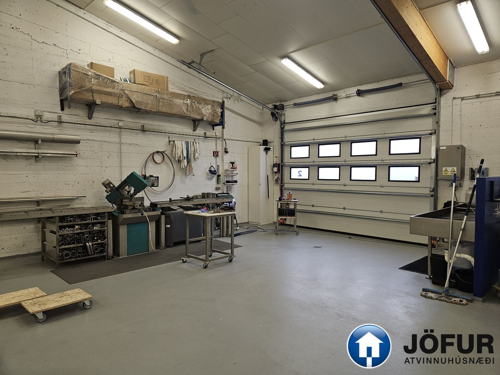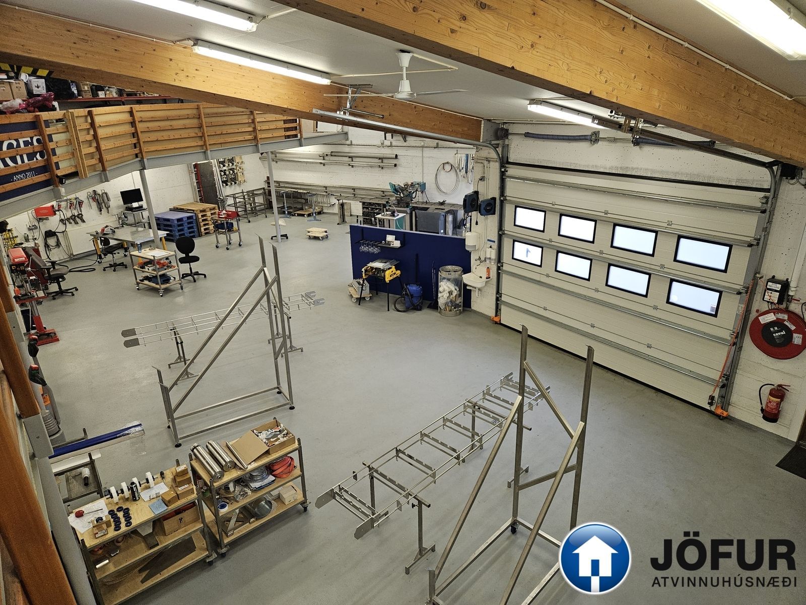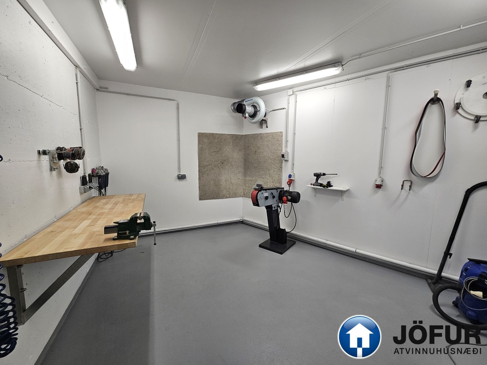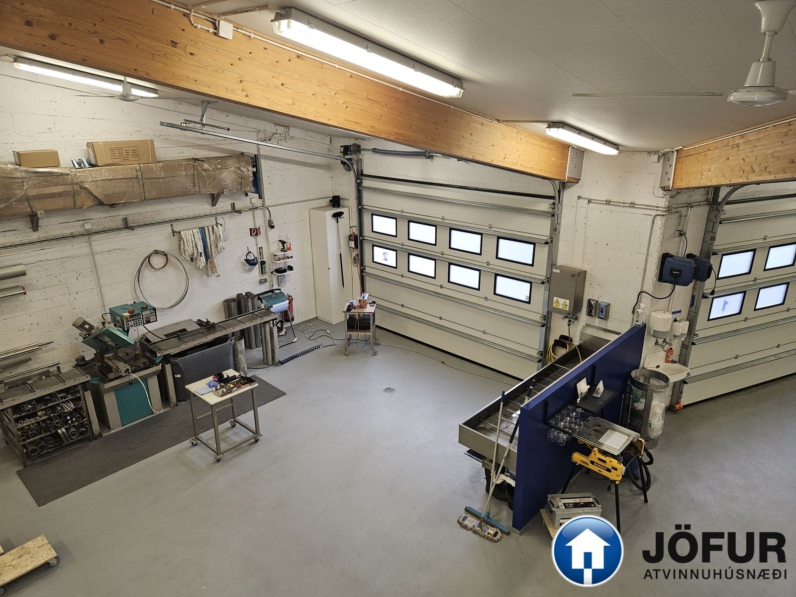 Neðri hæð: Góður vinnusalur, góð lofthæð yfir hluta salarins, um 2,7 m. undir millipalli, epoxy gólfefni, tvær innkeyrsluhurðir (H 3,0m. x B 4,0 Br.), tvær snyrtingar til staðar, herbergi/geymsla (ca.18 m²) sem er sprengjuheld.