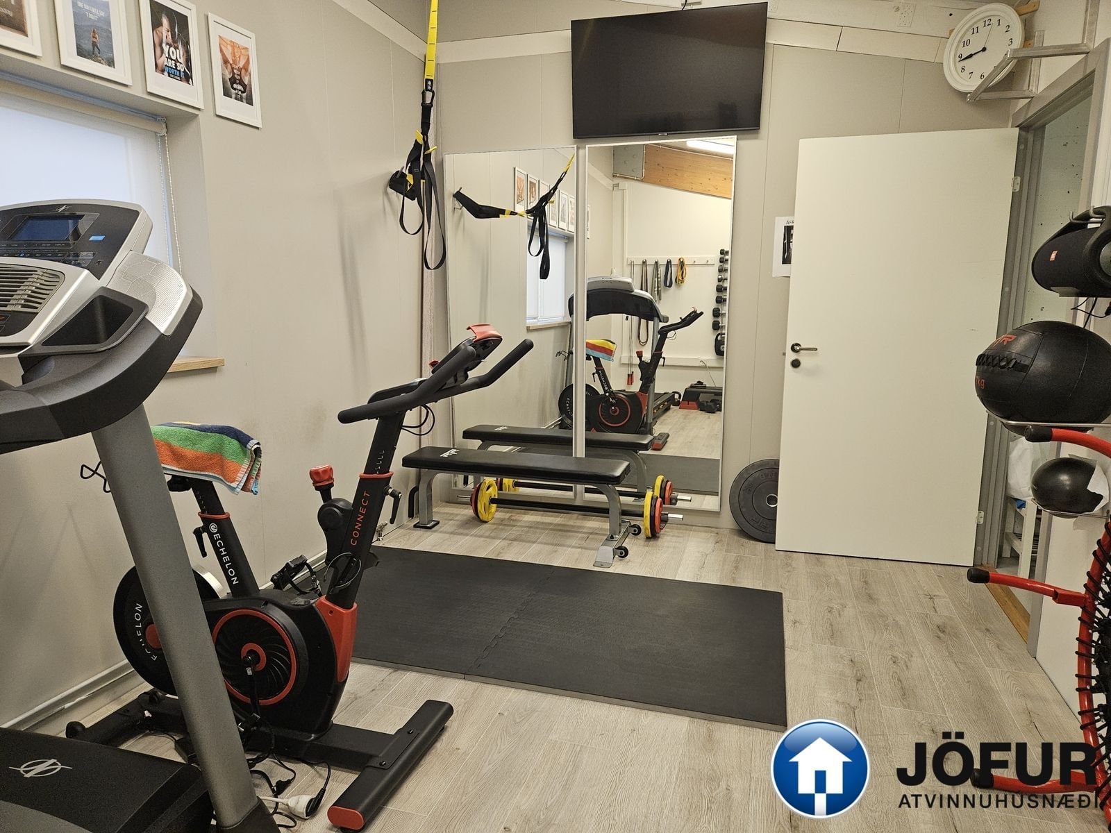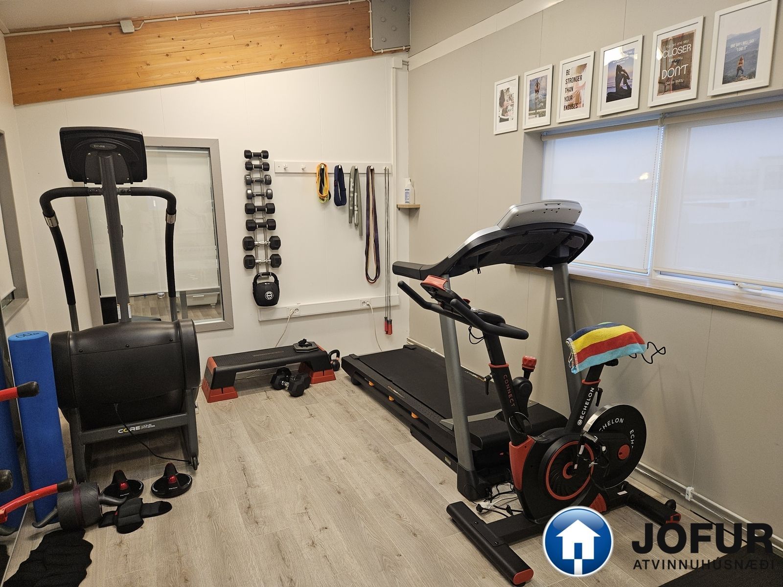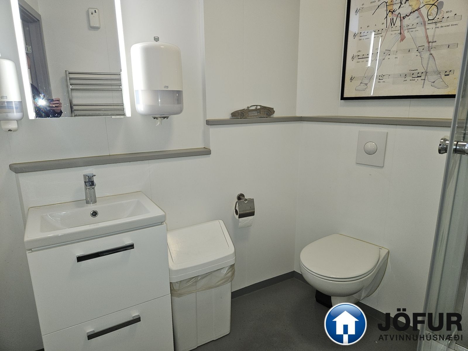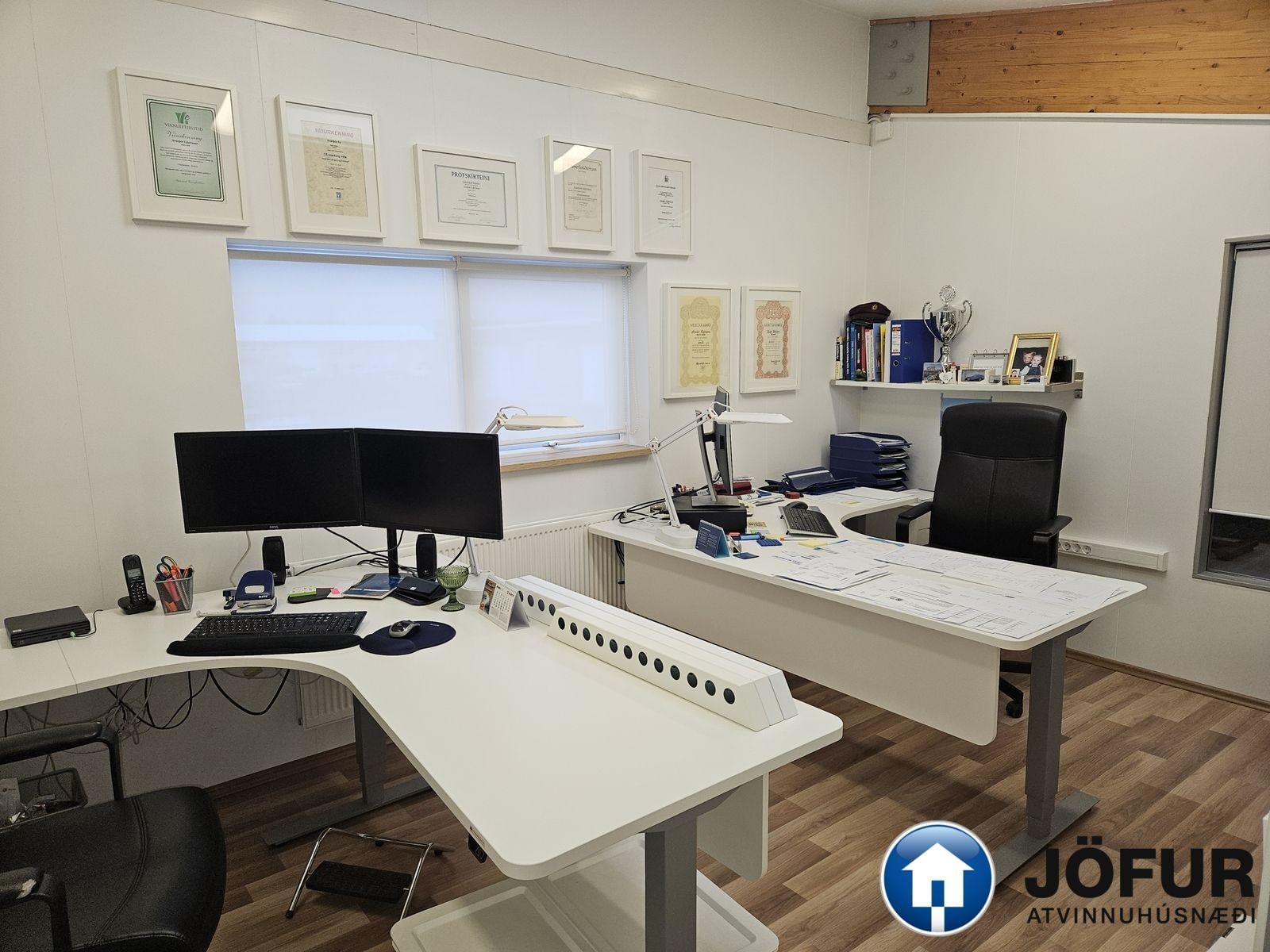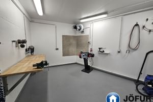 Neðri hæð: Góður vinnusalur, góð lofthæð yfir hluta salarins, um 2,7 m. undir millipalli, epoxy gólfefni, tvær innkeyrsluhurðir (H 3,0m. x B 4,0 Br.), tvær snyrtingar til staðar, herbergi/geymsla (ca.18 m²) sem er sprengjuheld.