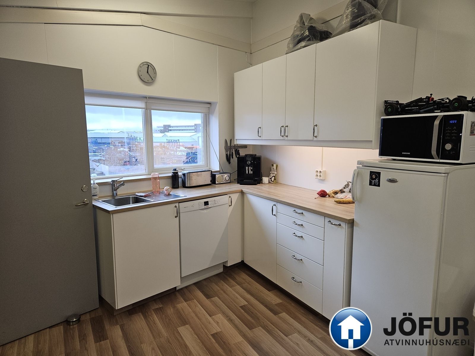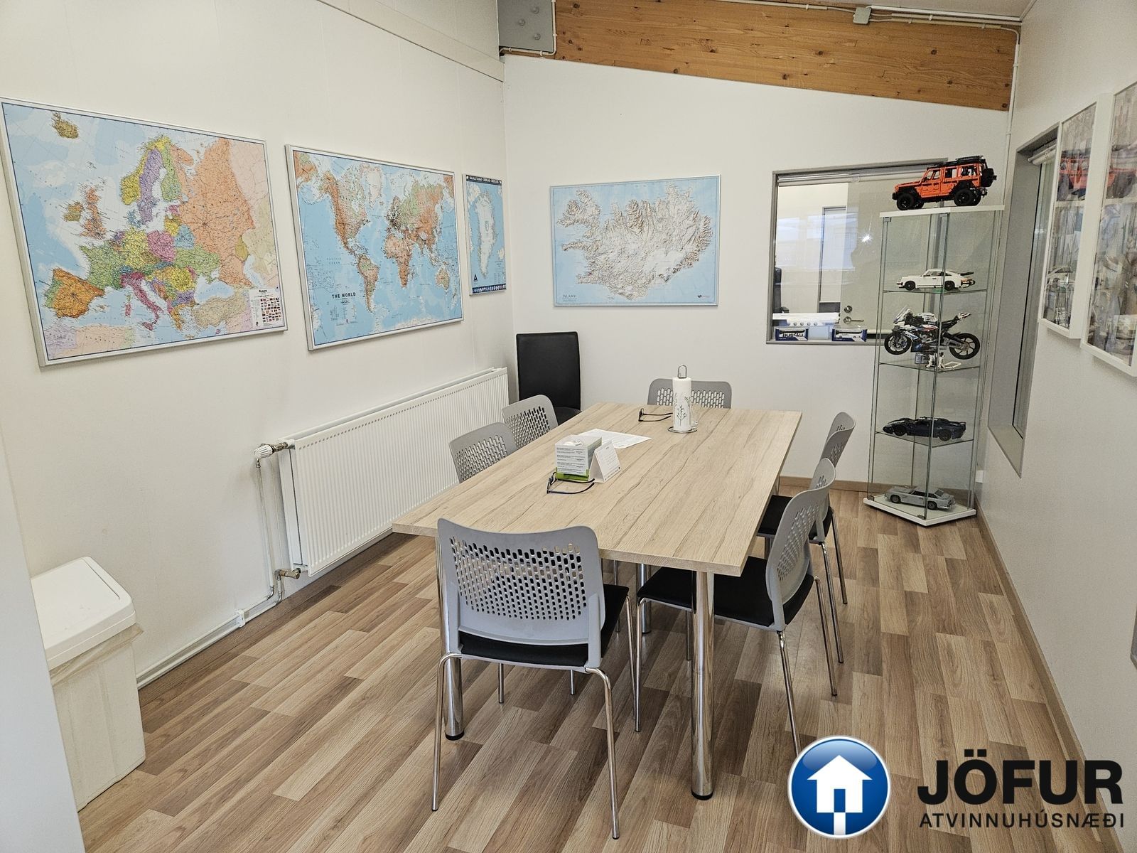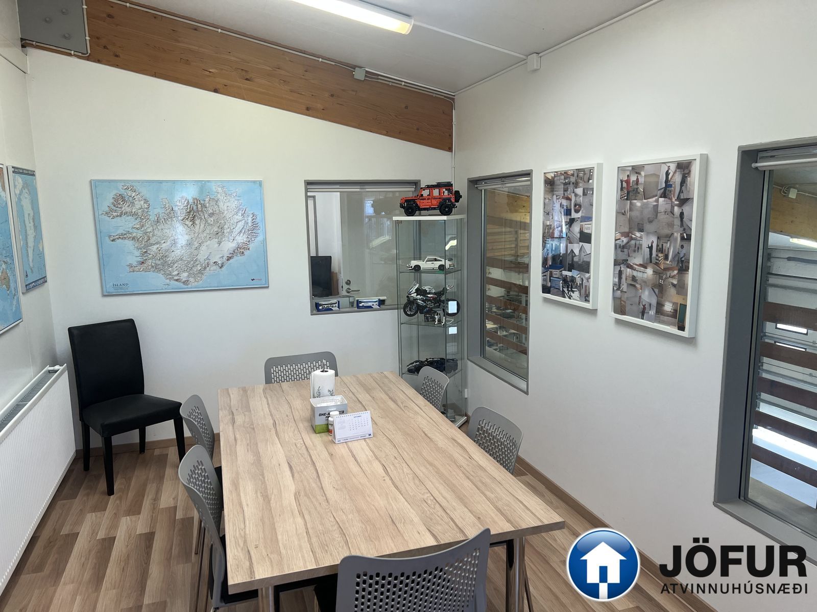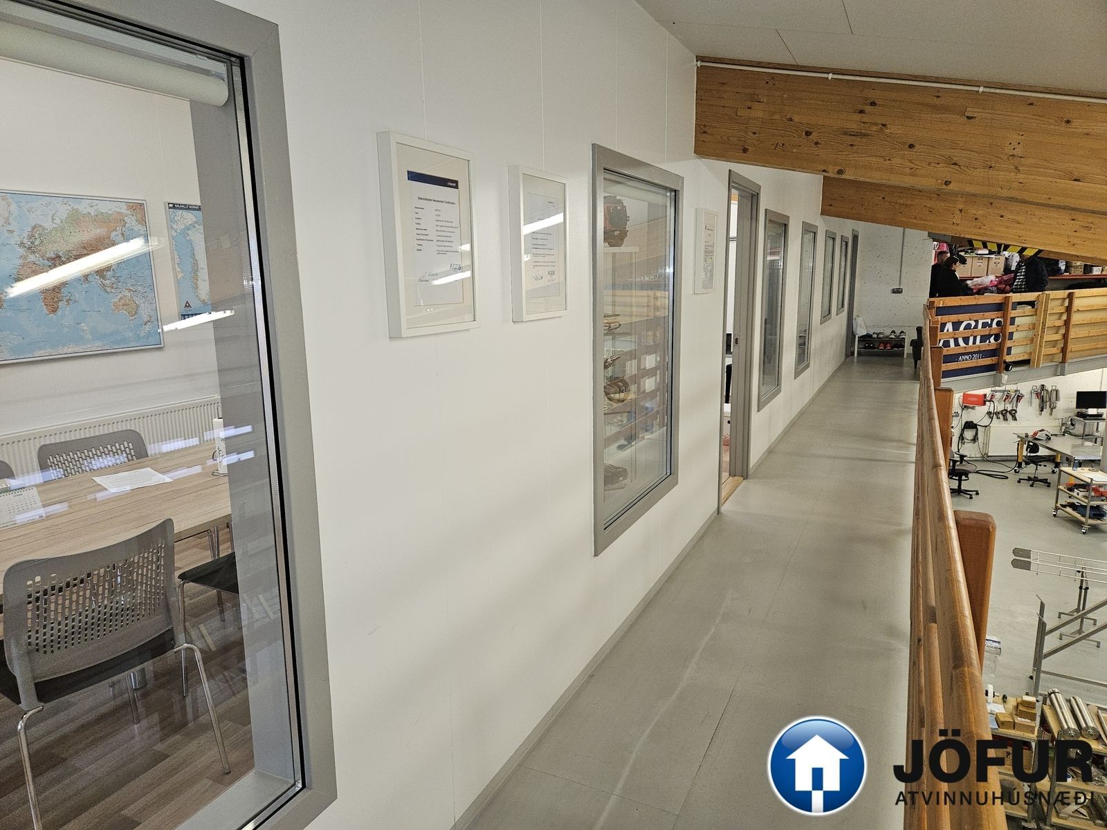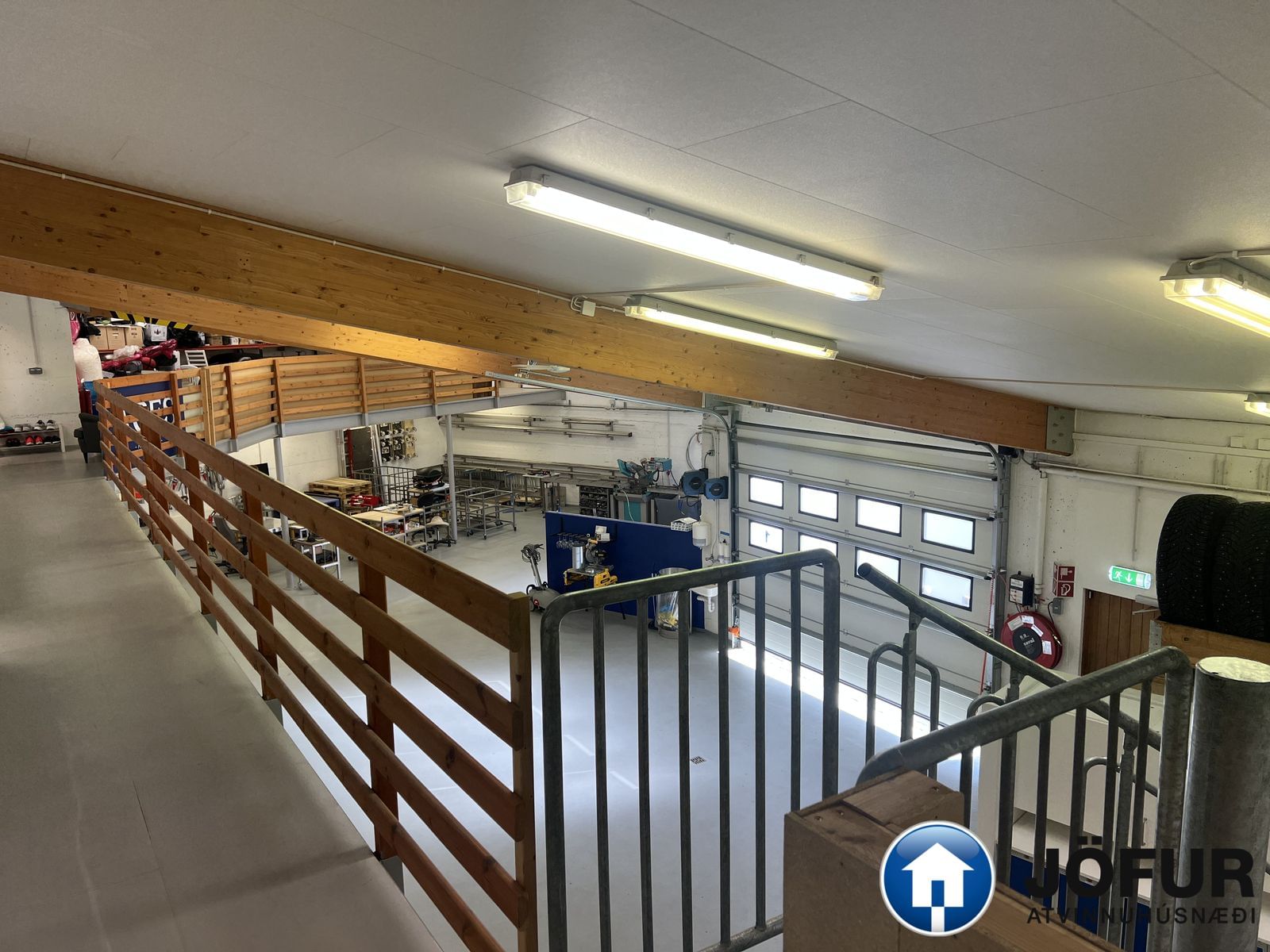 Efri hæð: Stálstigi upp á aðra hæð, gangur- svalir, opið stórt rými sem hægt að nýta fyrir ýmislegt s.s. lager og fleira, starfsmannaaðstaða (eldhús) með ljósri innréttingu, tvær skrifstofur, geymsla (ca. 18 m²) sem er sprengjuheld, parket er á gólfinu á eftir hæðinni.