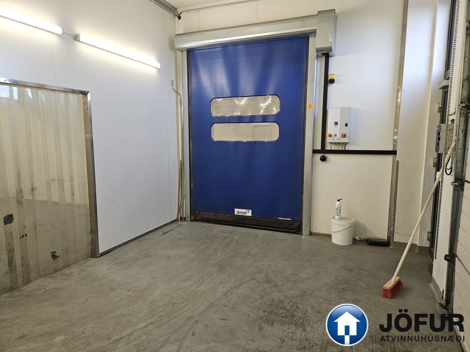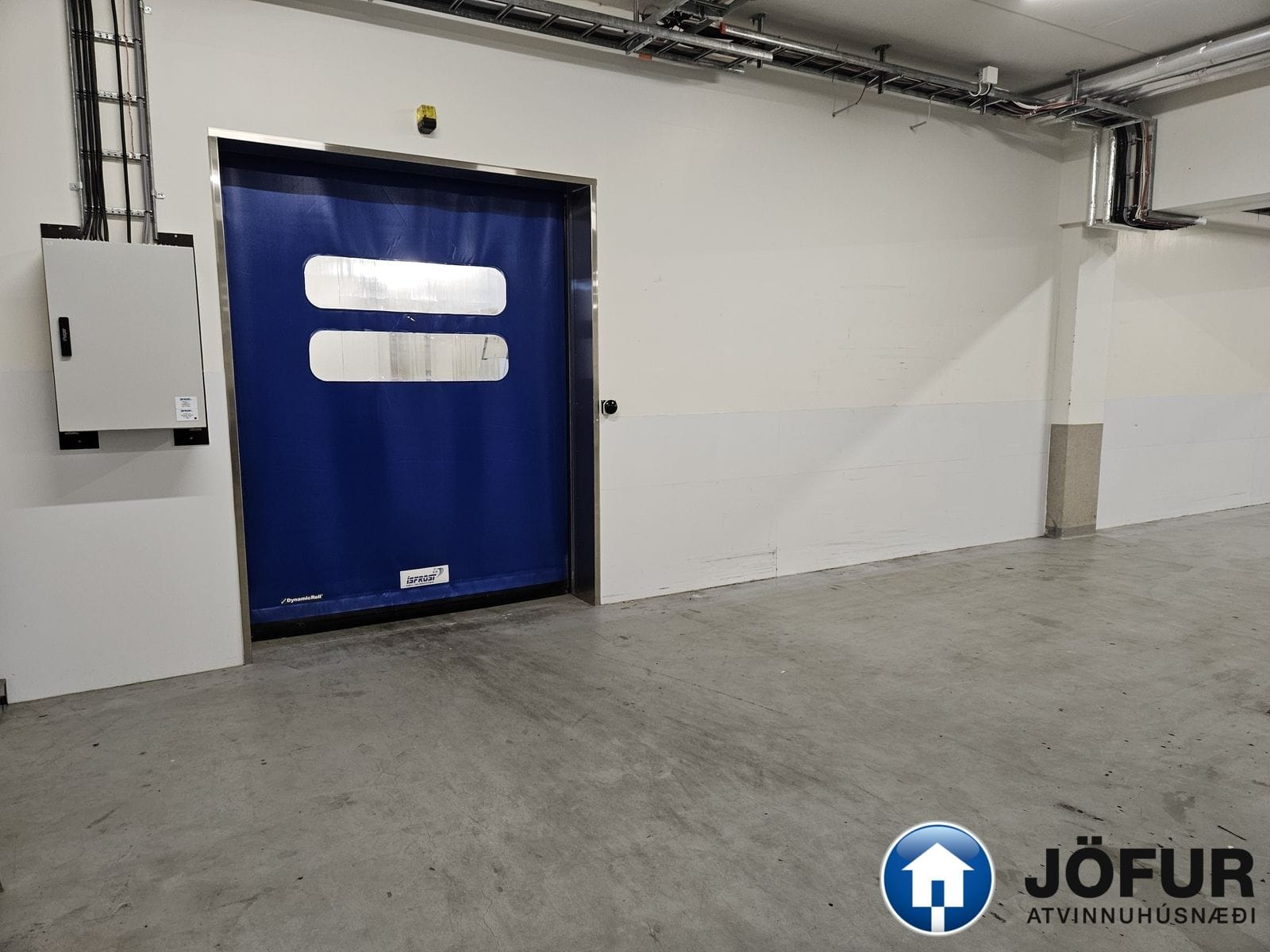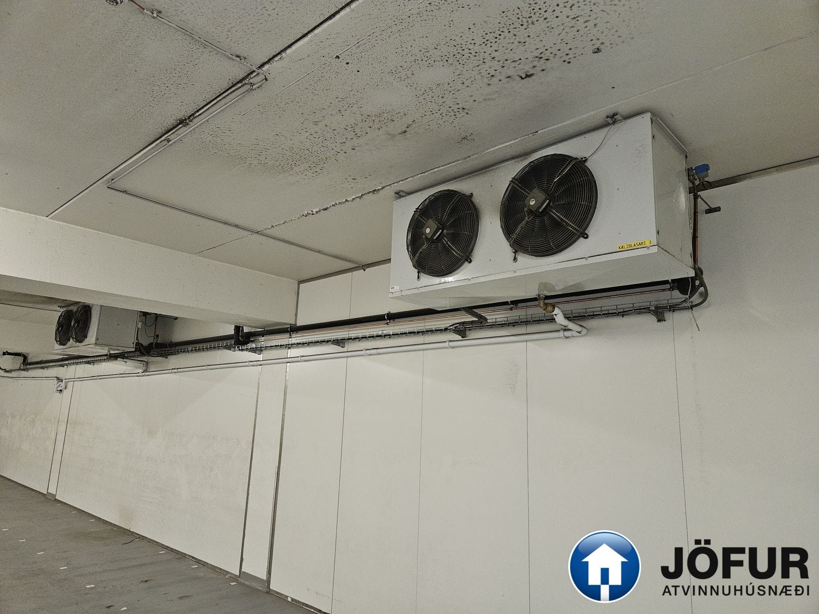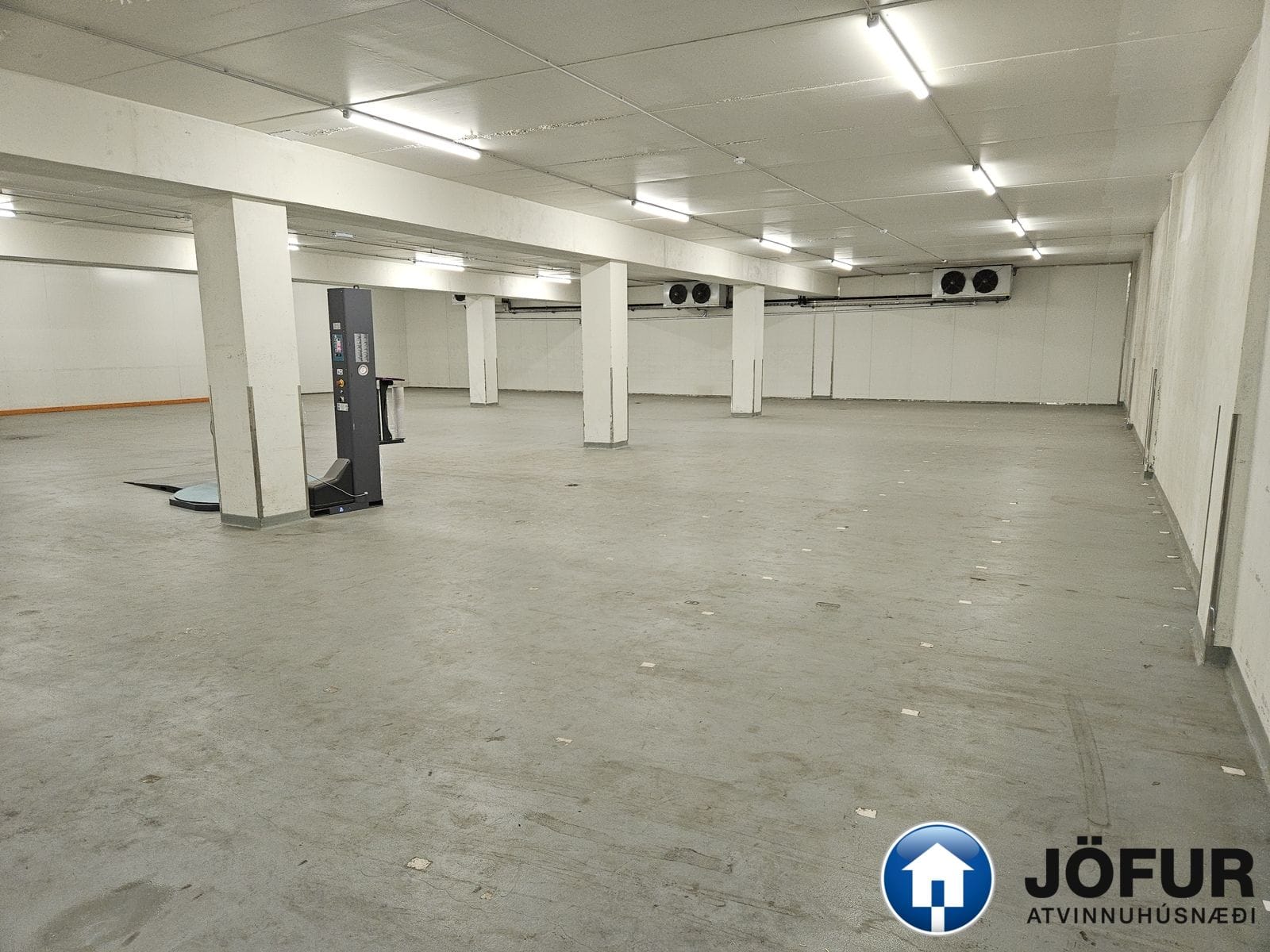 Nánari lýsing: Skiptist upp í tvö aðskilin rými með millivegg, skrifstofurými með eldhúsinnréttingu, fundarherbergi og snyrtingar. 3ja fasa rafmagn er til staðar. Lofthæð í lagerrýmum er frá 3,2 - 3,6 m. en er lægri undir bitum, (um 2,7 m.). Kælirými er um 520 m² að grunnfleti. Niðurföll eru í gólfum. Hæð á innkeyrsluhurðum er um 3 m. Tvær þeirra er um ramp. VSK leggst við leigufjárhæðina.