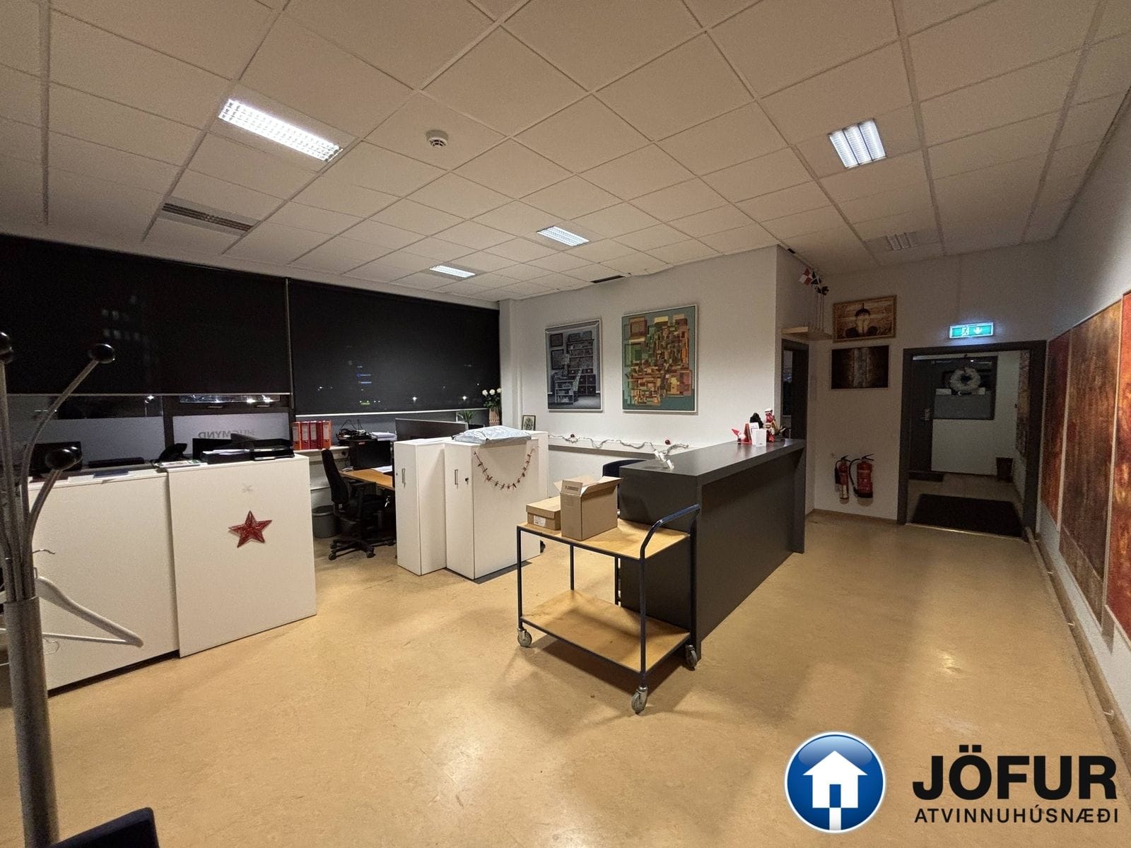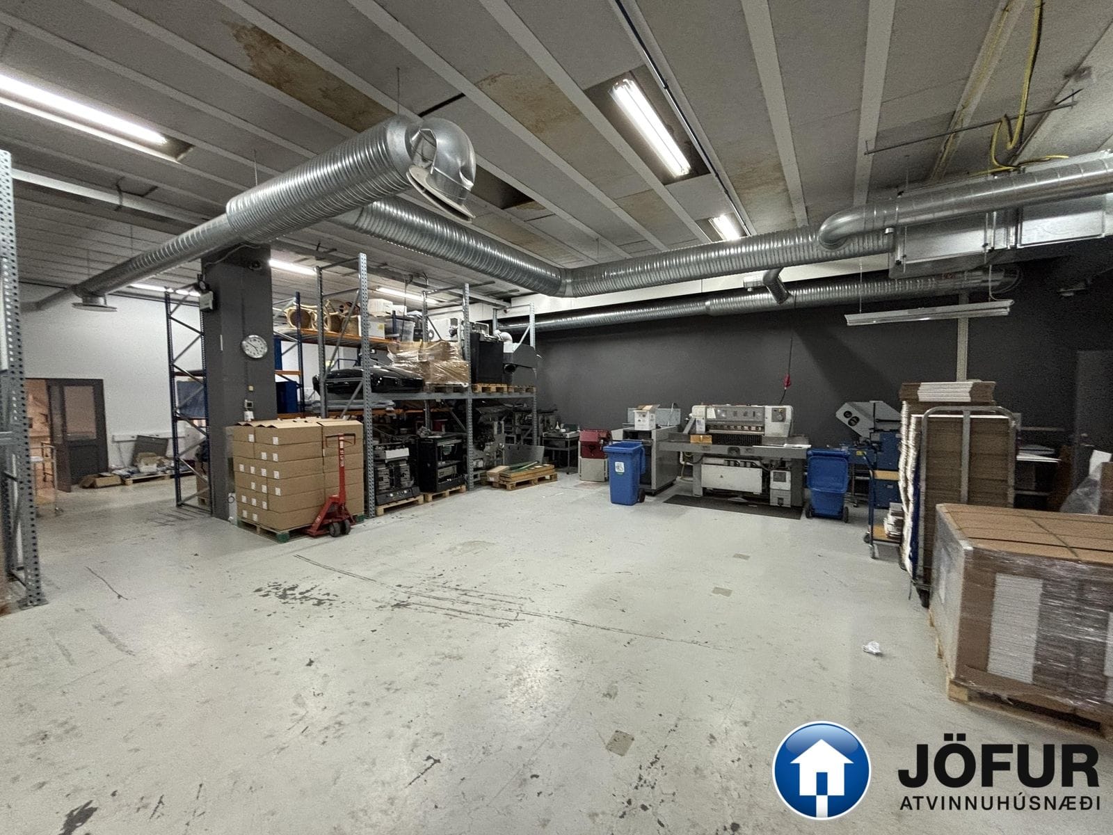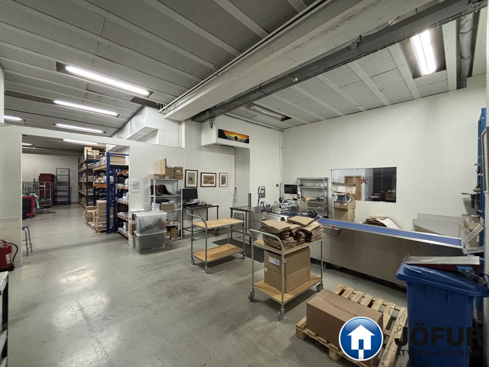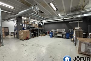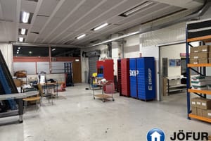 Húsnæðið samanstendur af móttöku, skrifstofu með tveimur lokuðum rýmum, kaffistofu og stóru opnu vinnurými/lager. Stór innkeyrsluhurð er að rýminu og góð lofthæð er um 4.m.