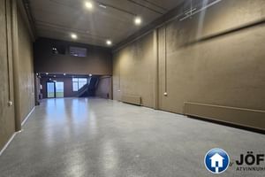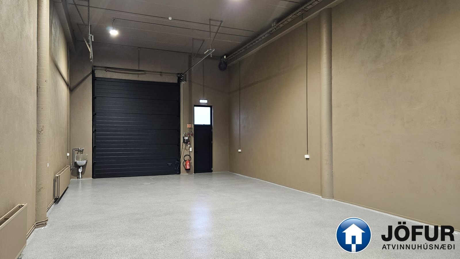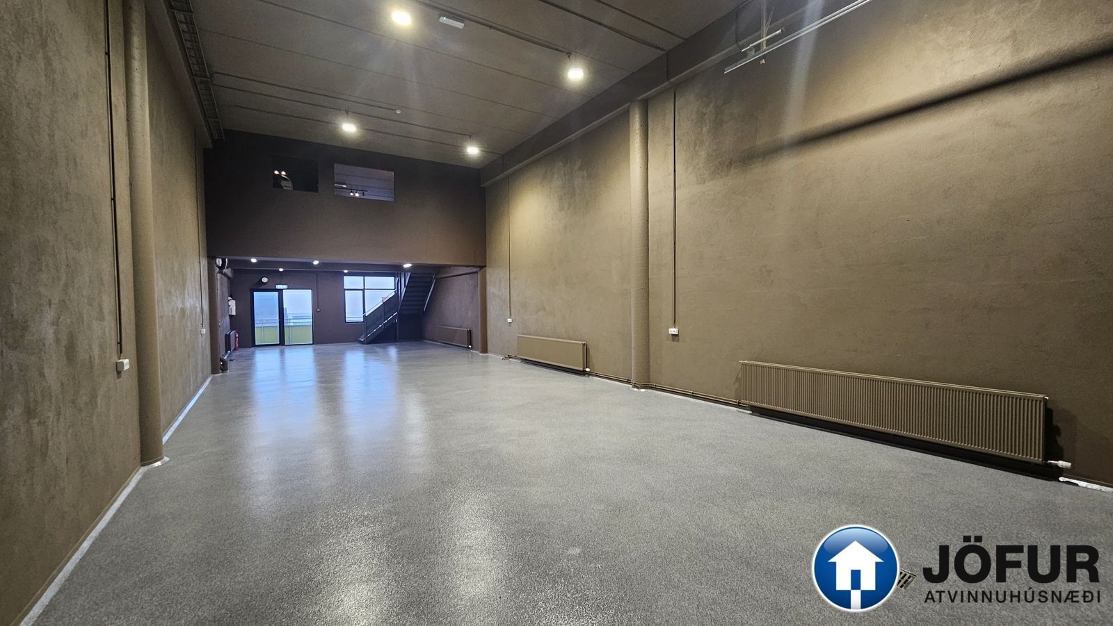 Jarðhæðin er opin salur með 3ja fasa rafmagni og epoxy á gólfi. Hægt er að ganga út á svalir bæði frá jarðhæð og af millilofti.