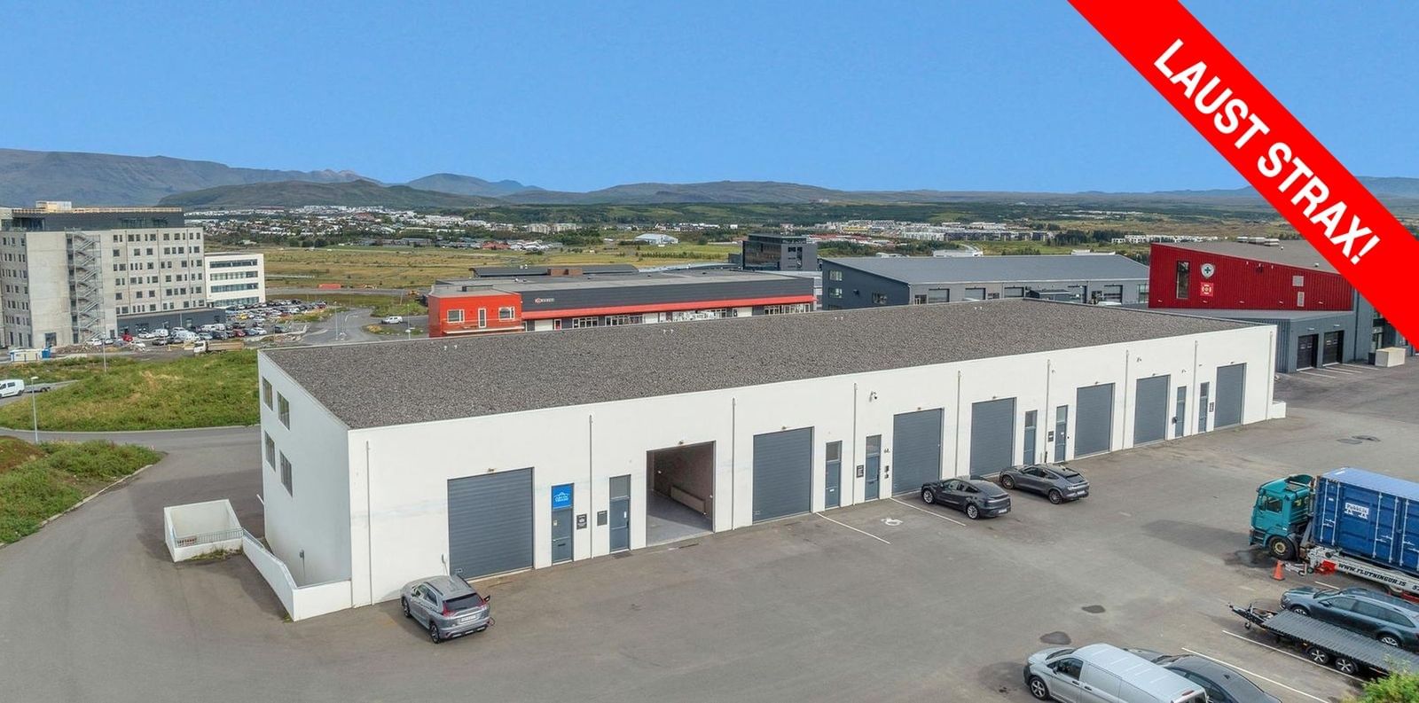 5 bílastæði á malbikuðu plani fylgja rýminu, 2 fyrir framan hið leigða rými og 3 á móti.