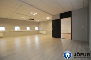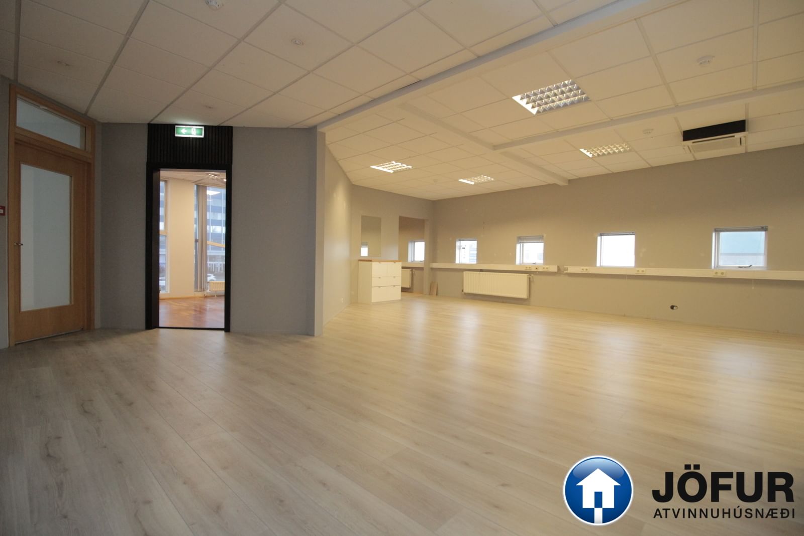 Húsnæðið er mest opið vinnurými en auðvelt er að stúka af skrifstofu í rýminu. Tveir inngangar eru í rýmið.