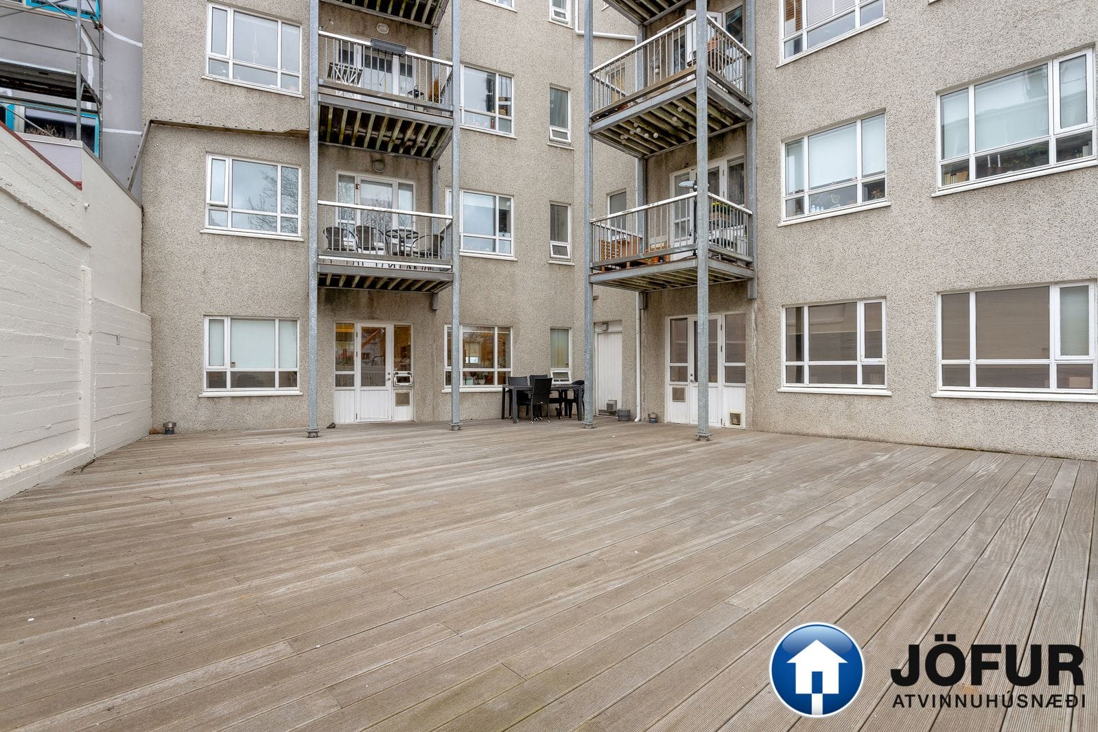 Nánari lýsing: Rýmið skiptist upp í opið skrifstofurými sem hefur verið stúkað upp í tvö rými með léttum milliveg, eina lokaða skrifstofu og eitt fundarherbergi, hægt er að koma fyrir kaffistofu og snyrtingu þar sem lagnir eru til staðar. Á gólfum er steinteppi. Útgengi er á sameiginlegan sólpall hússins bakatil. Húsnæðinu fylgir 7,3 m² sérgeymsla í kjallara og hlutdeild í þvottahúsi sem er í sameign.