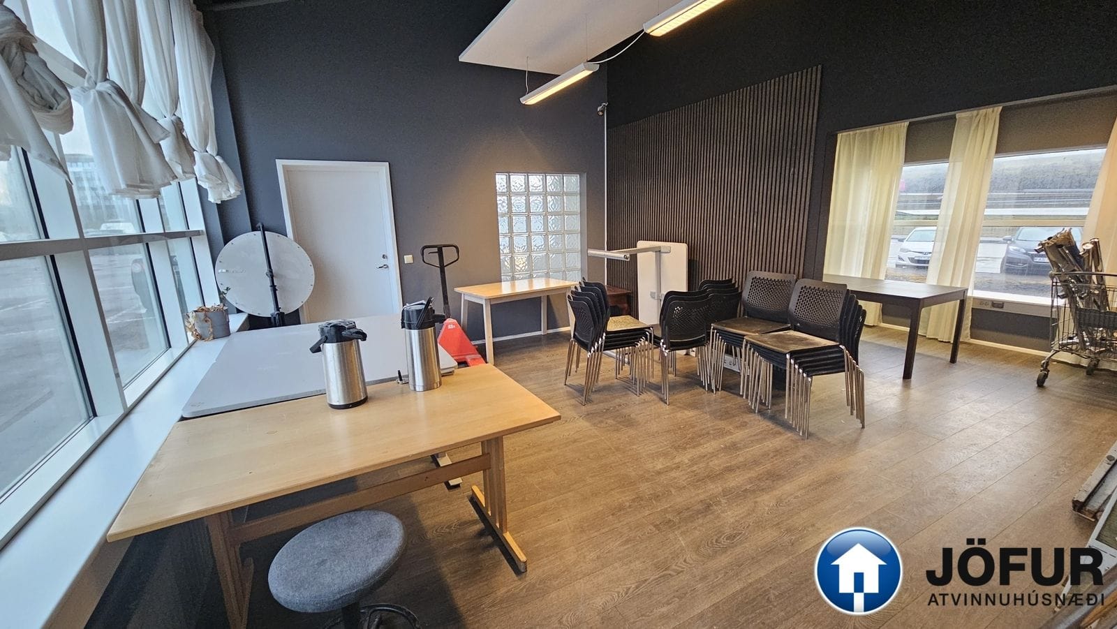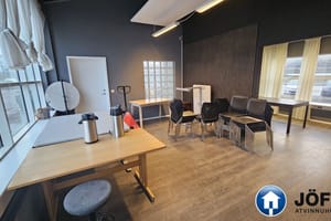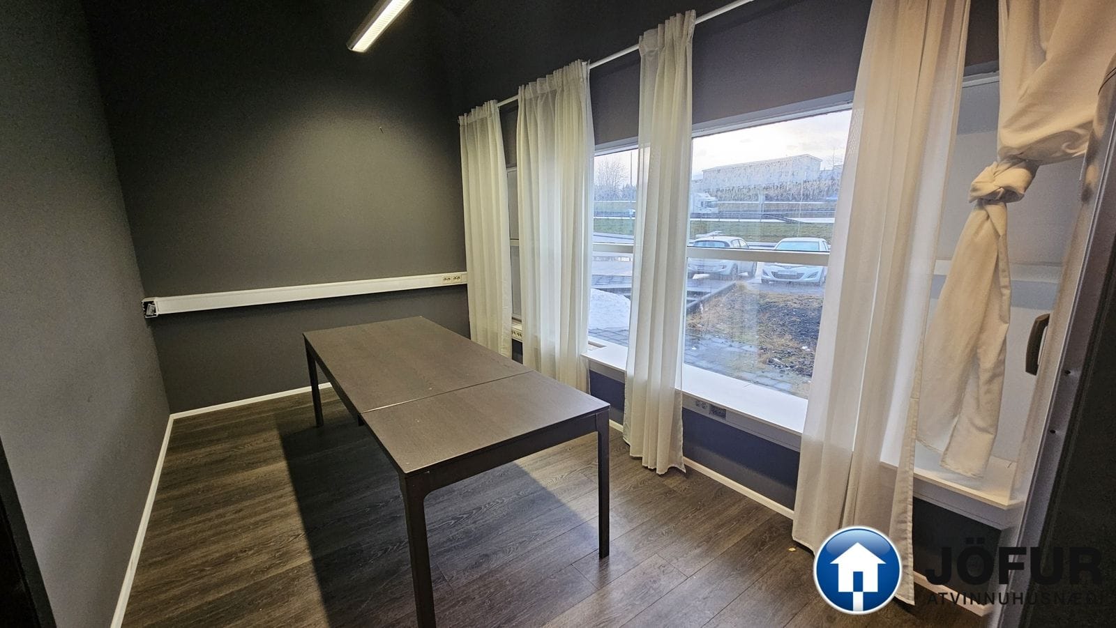Rýmið samanstendur af opnum rými, setustofu/móttöku, tveimur skrifstofu, kaffikrók og salerni.