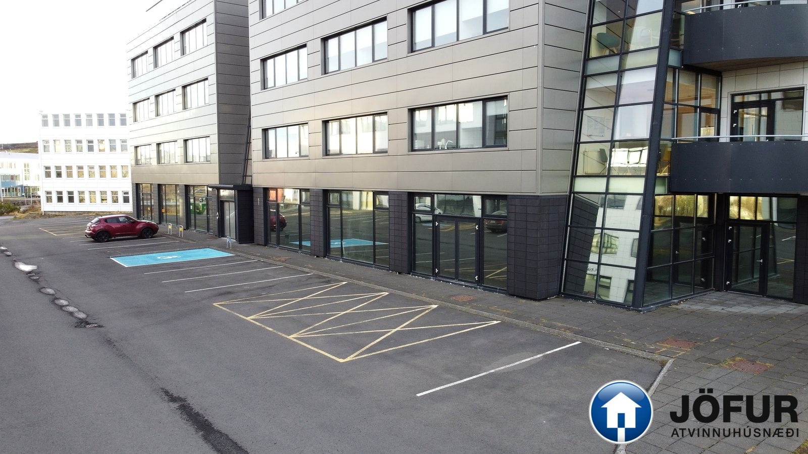 Sér inngangur er í rýmið beint inn af bílastæði.