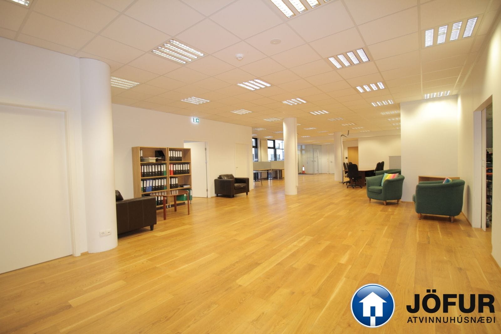 Parket á gólfi og kerfisloft með innfelldri lýsingu.