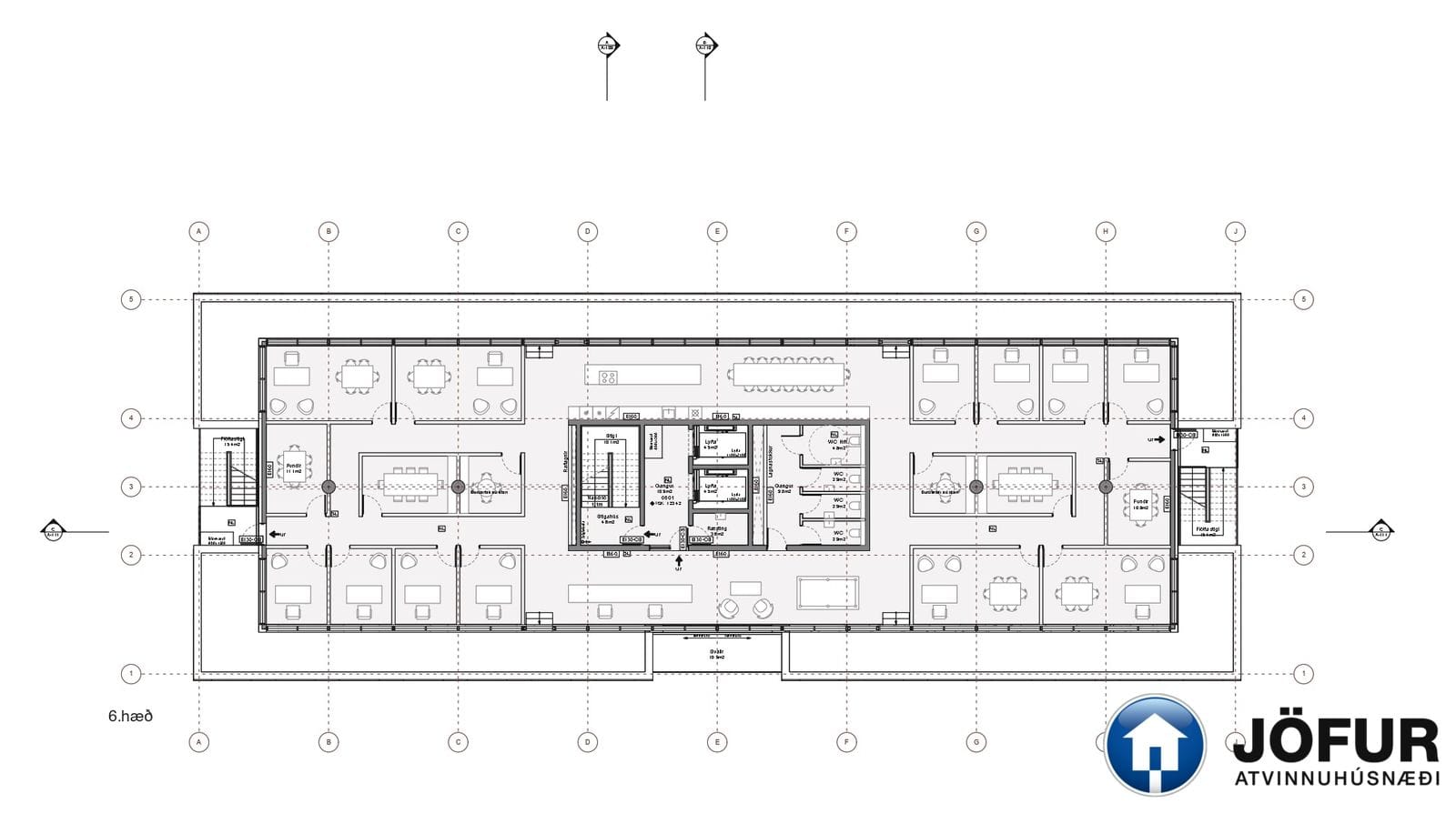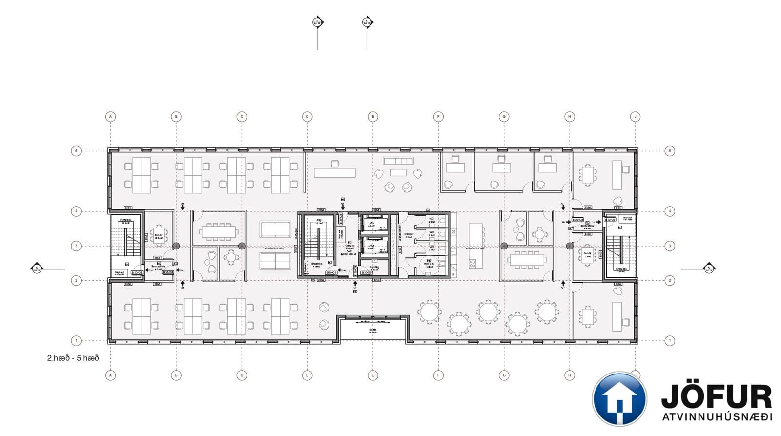 Á 2. til 5. hæð byggingar eru 715fm skrifstofuhæðir ásamt 485fm skrifstofu á 6. hæð sem verður inndregin með þaksvölum sem ná umhverfis alla hæðina. Hæðirnar verða hannaðar með nútímalegu vinnuumhverfi í huga og gert er ráð fyrir blöndu af opnu vinnurými, lokuðum skrifstofum og fundarherbergjum, ásamt rúmgóðri kaffistofu. Hæðirnar verða bjartar með stórum gluggum á öllum hliðum og aðgengi að svölum af hverri hæð. Gott aðgengi er að öllum hæðum með tveimur lyftum og stigahúsi. Gert er ráð fyrir fjórum salernum á hverri hæð, þar af eitt með aðgengi fyrir hjólastóla.
