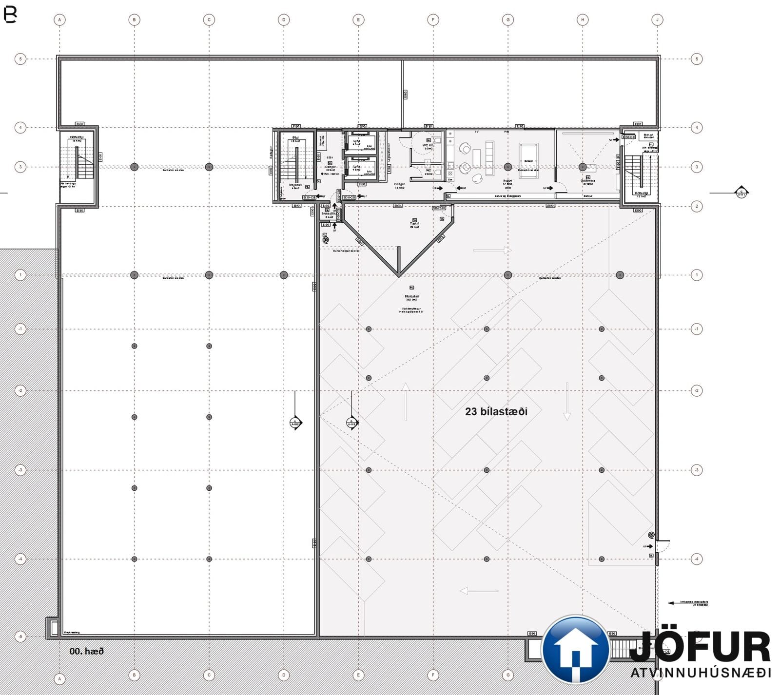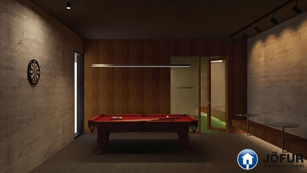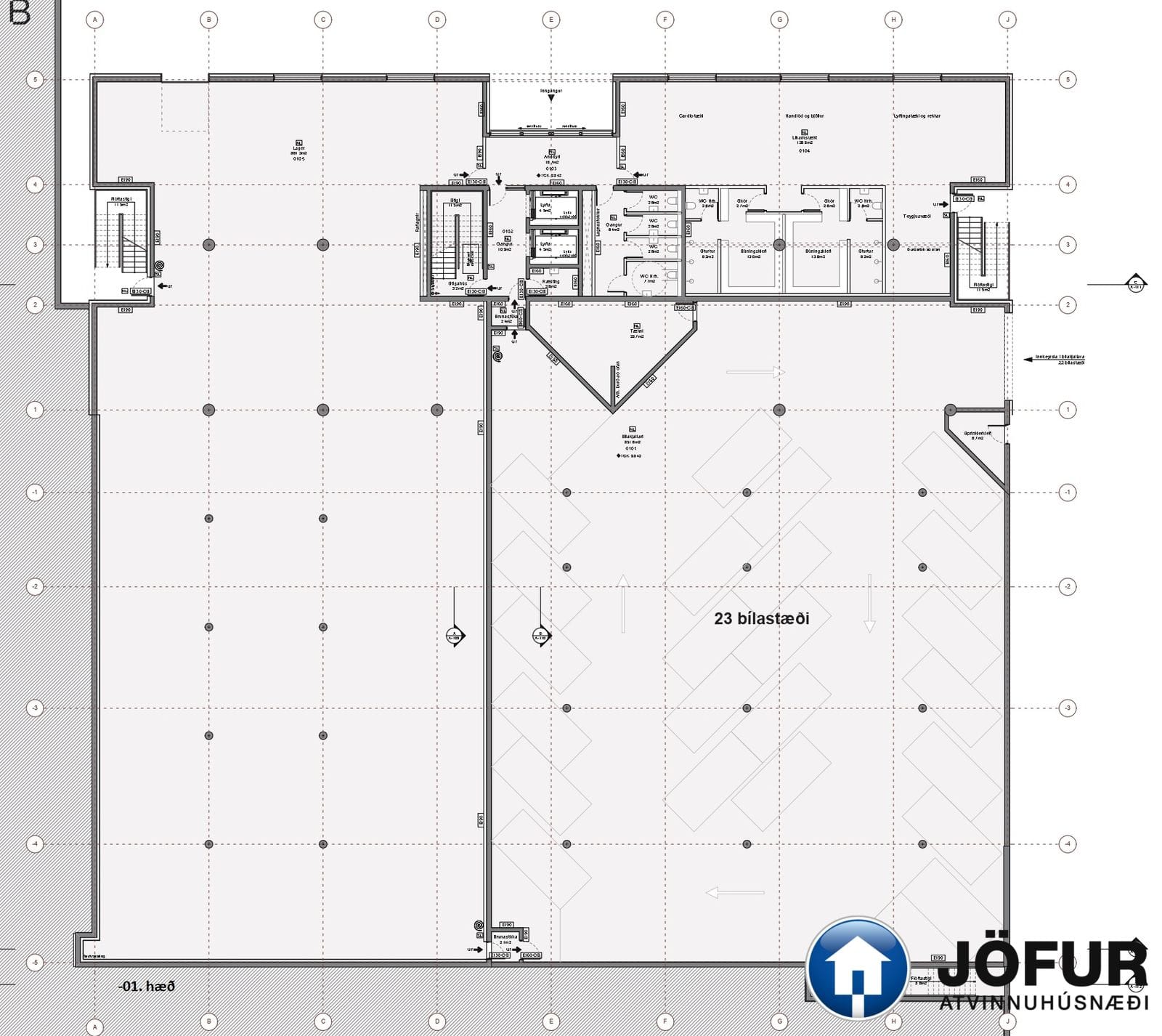 Í Kjallara er 910fm lager ásamt tvöföldum bílakjallara. Lofthæð lagerrýmisins er rúmlega tvöföld n.t.t. 7,5m sem skapar mikla möguleika fyrir tilvonandi leigutaka t.d. fyrir háar hillusamstæður, hirslur og annað slíkt. Í kjallara verður jafnframt flott aðstaða fyrir starfsmenn hússins, þar á meðal hjólageymsla, hobbýherbergi með golfhermi, líkamsrækt o.fl.