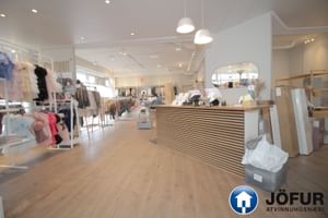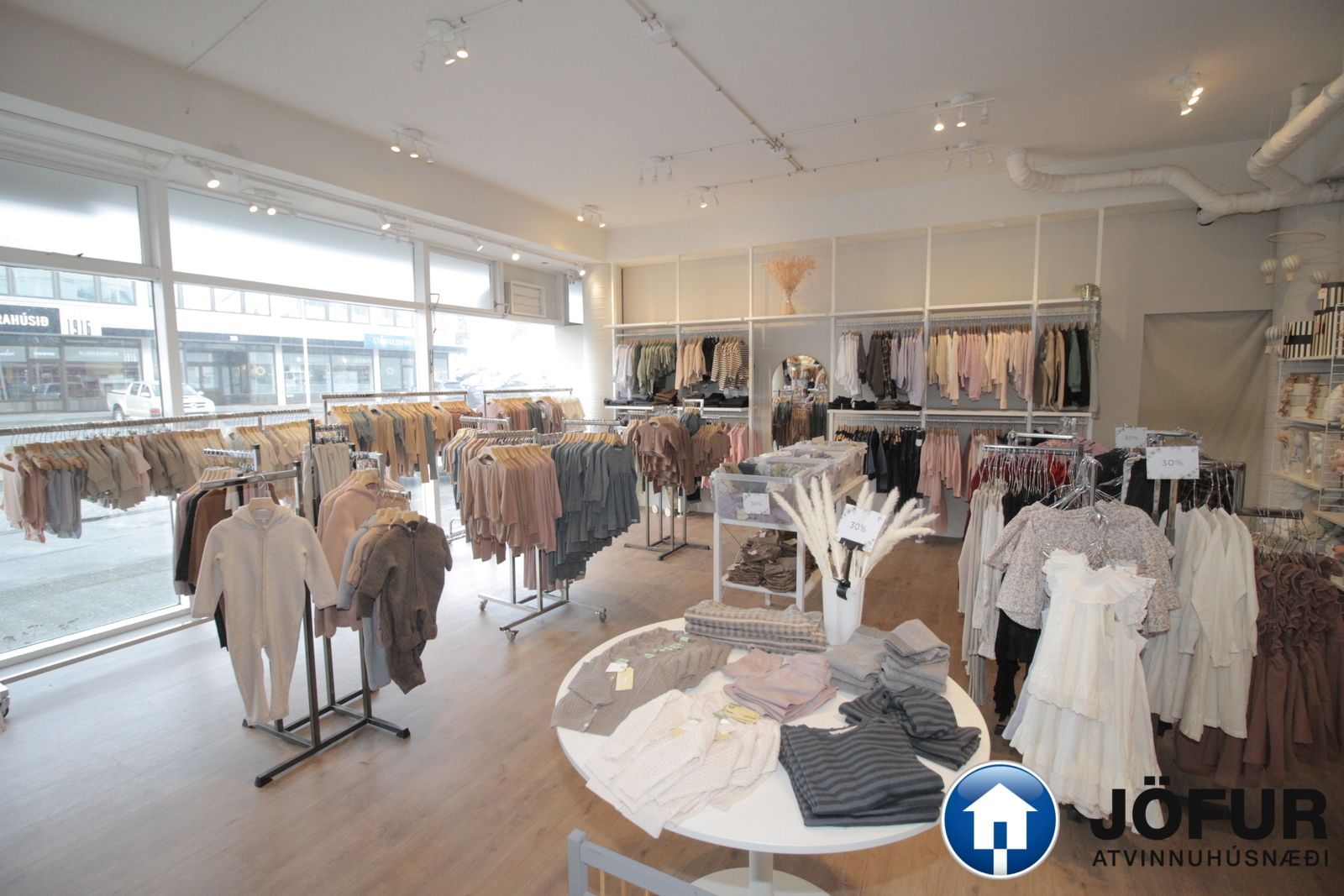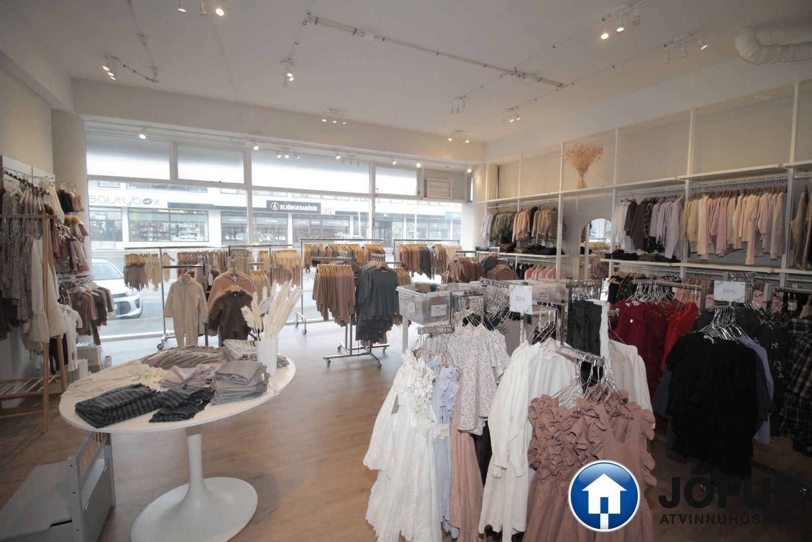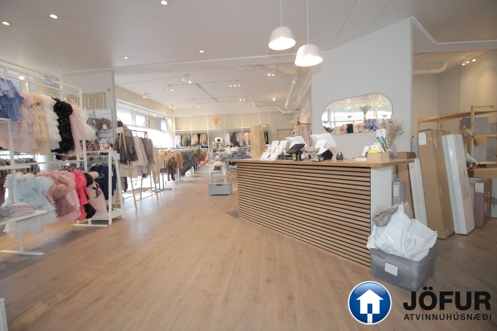 Húsnæðið skiptist í opið verslunarrými með góðum sýningargluggum, eitt lokað herbergi, bak-/lagerrými og snyrtingu.
