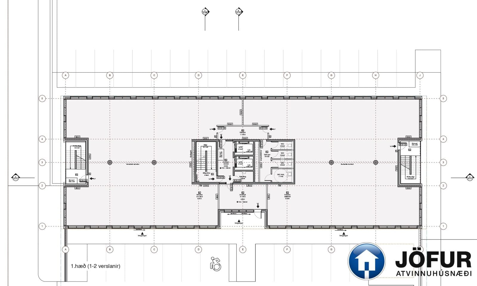 Um er að ræða aðkomuhæðin hússins sem er hugsuð sem 675 m² verslunar- eða þjónustuhæð en þar væri jafnframt hægt að vera með skrifstofur eða mötuneyti fyrir húsið. Gert er ráð fyrir fjórum salernum á hæðinni, þar af eitt með aðgengi fyrir hjólastóla. Væntanlegur leigjandi getur komið að hönnun hæðar. Mögulegt er að legja aðkomuhæð með skrifstofum á eftir hæðum eða lager á neðri hæð eftir þörfum.