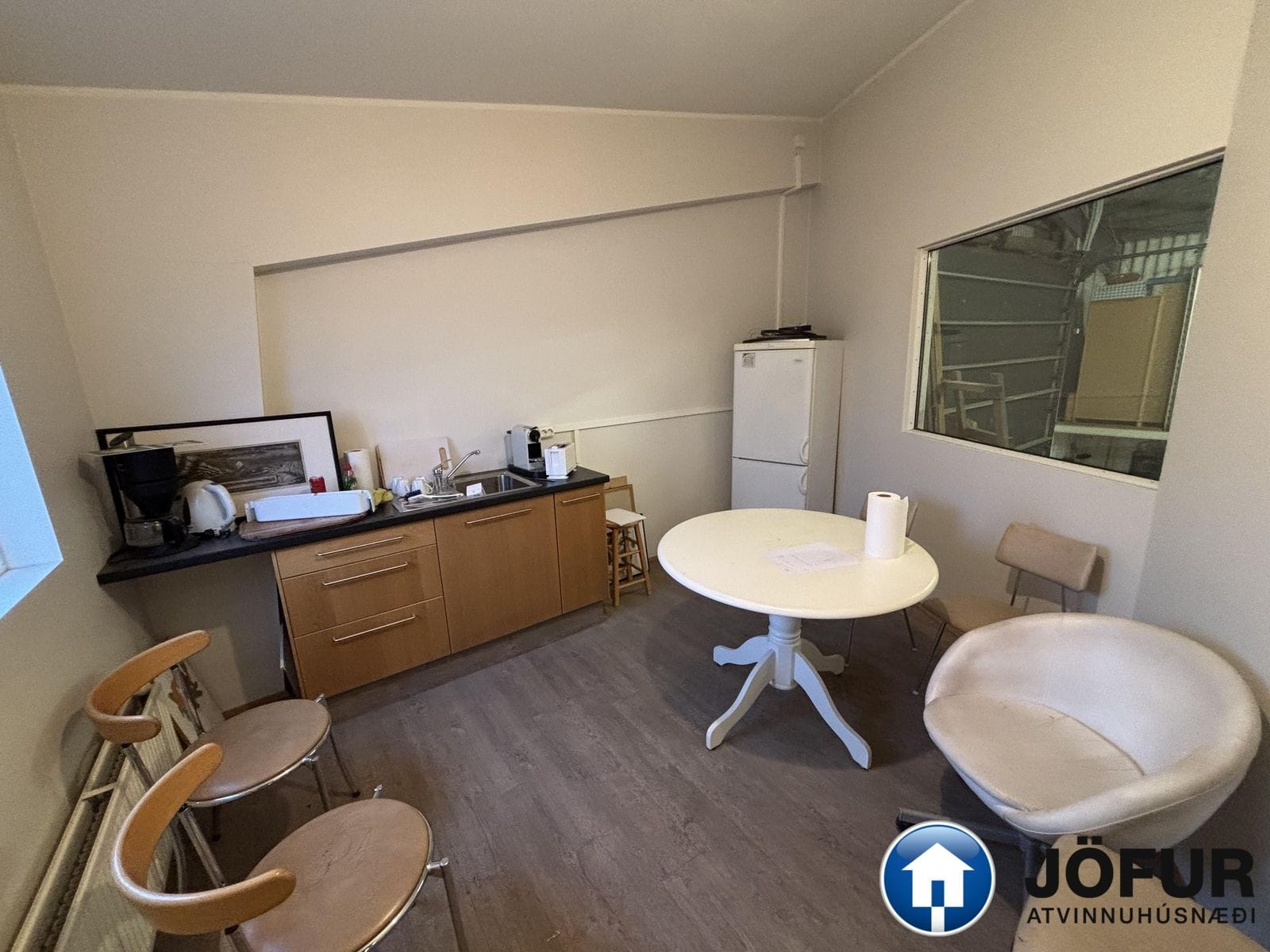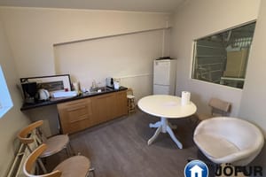 Snyrtileg kaffistofa með lítilli innréttingu, ísskáp o.fl. á millilofti.