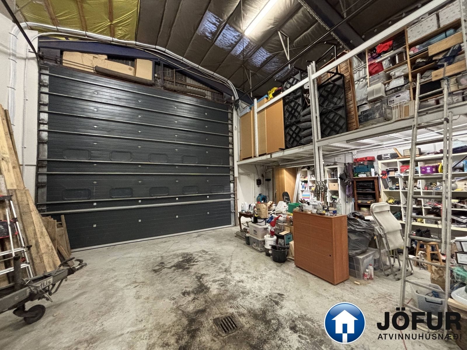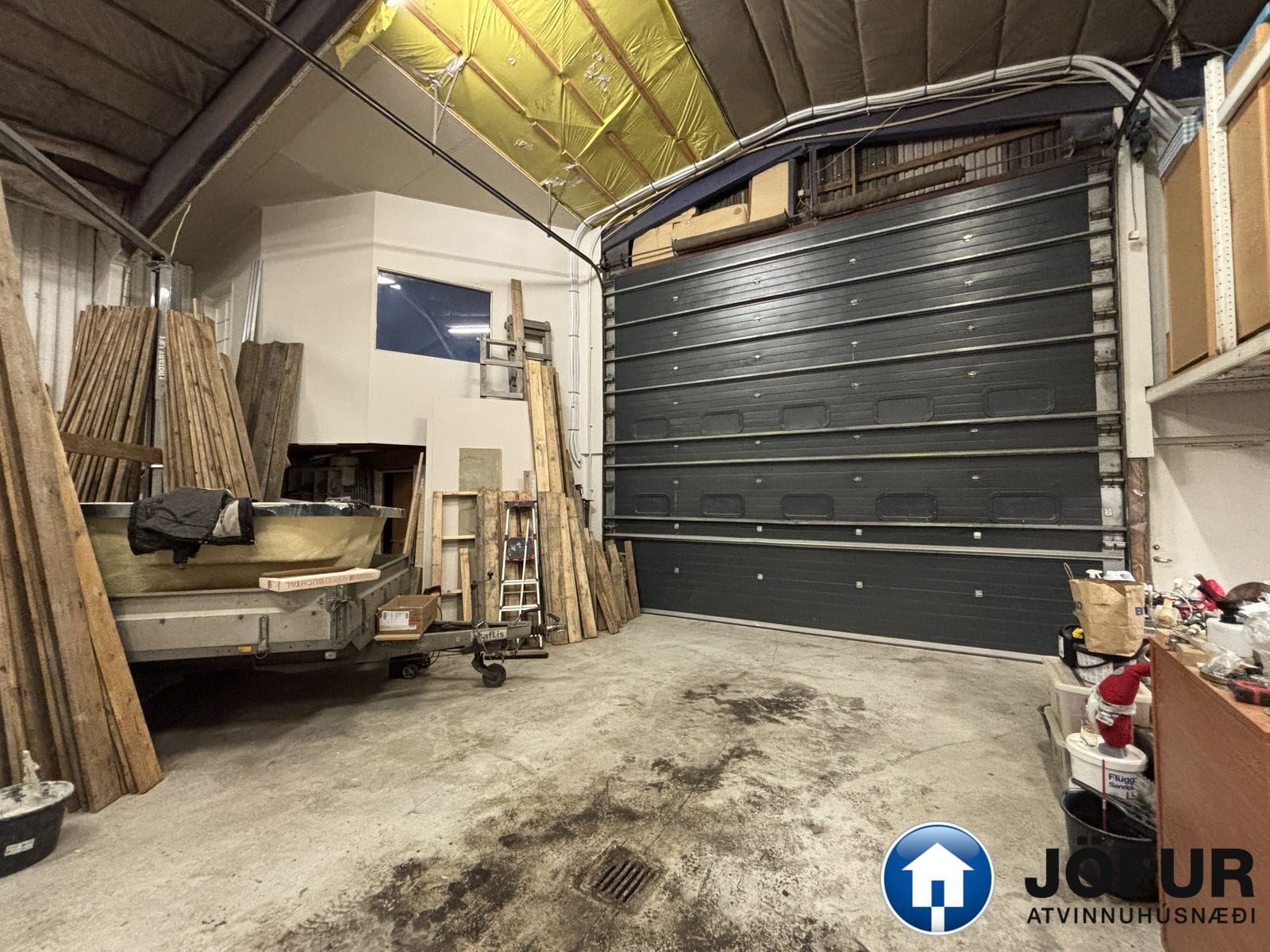Góð lofthæð sem er hæst um 7 m. og stór innkeyrsludyr er um 4,5 m á hæð. Til viðbótar er um 15 m². geymsluloft.