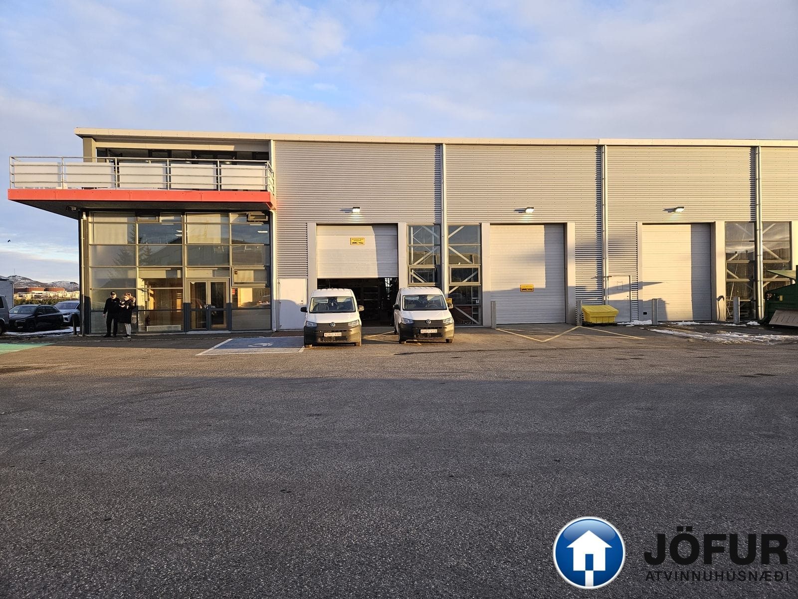 Húsnæðið er stálgrindarhús sem skiptist upp í lagerrými með 7 - 8 m. lofthæð með samtals 3 háum innkeyrsluhurðum, starfsmannaaðstöðu, afgreiðslufronti, eitt tæknirými, inntaksrými og eina snyrtingu á jarðhæð í norðurhluta hússins. Sameiginlegur inngangur/ anddyri er einnig á jarðhæð. Á 2. hæð er opið skrifstofurými og á 3. hæð, en þar er einnig stórt fundarherbergi, tvær lokaðar skrifstofur og stór kaffistofa/eldhús með útgengi á vestur svalir. Skrifstofuhluti húsnæðisins er um 285 m². Hæð á innkeyrsluhurðum í lagerhluta sem eru þrjár talsins er um 4,3 m. Niðurföll eru í glólfum. Gott athafnasvæði er á lóð húsnæðisins. Virðisaukaskattur leggst við leigufjárhæðina.