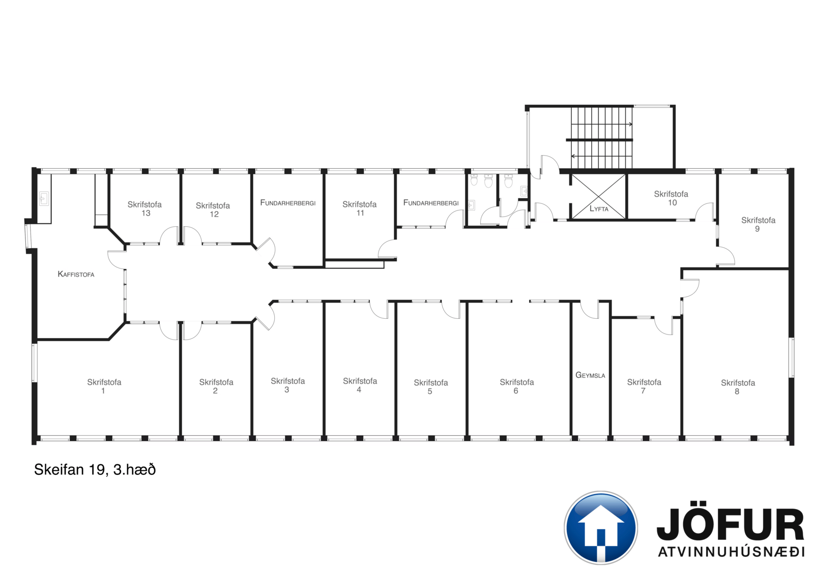 Á hæðinni eru samtals 11 skrifstofur. Allar skrifstofurnar eru með hlutdeild í tveimur fundarherbergjum á sömu hæð og kaffistofu.