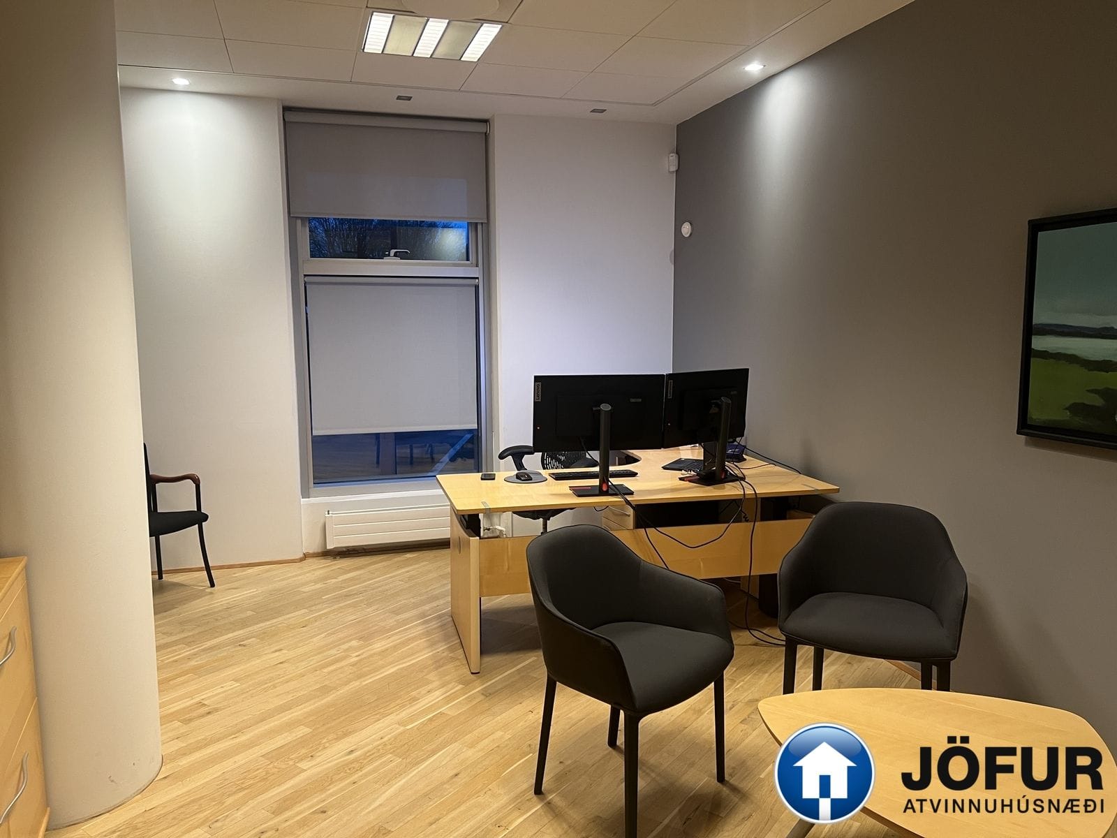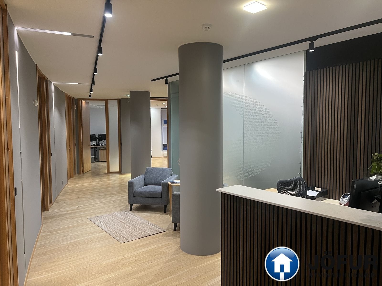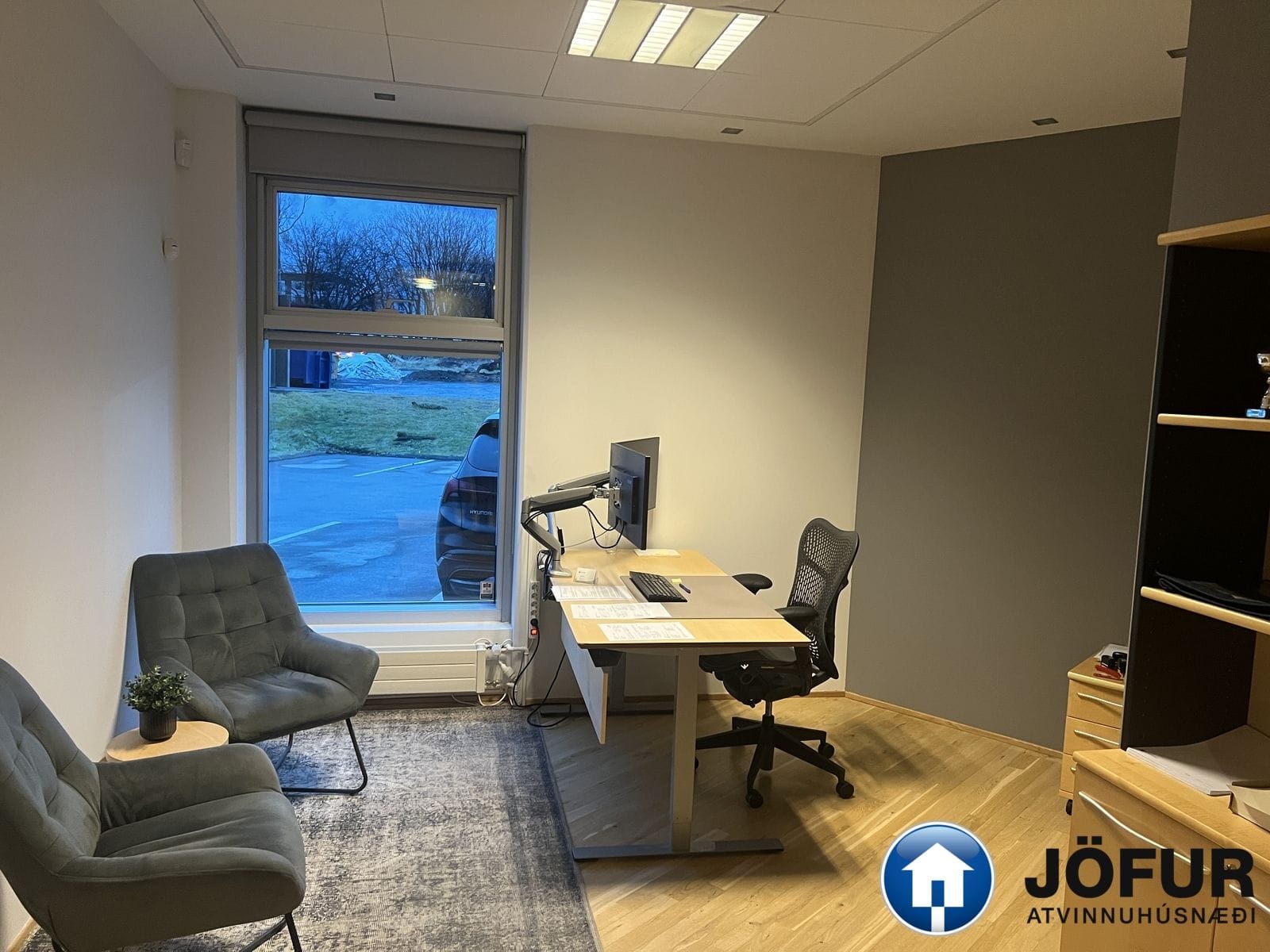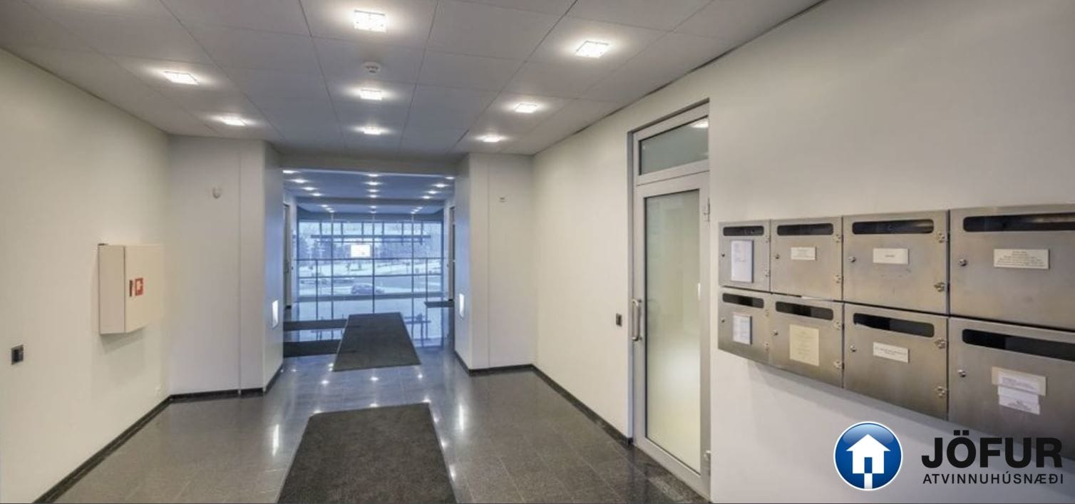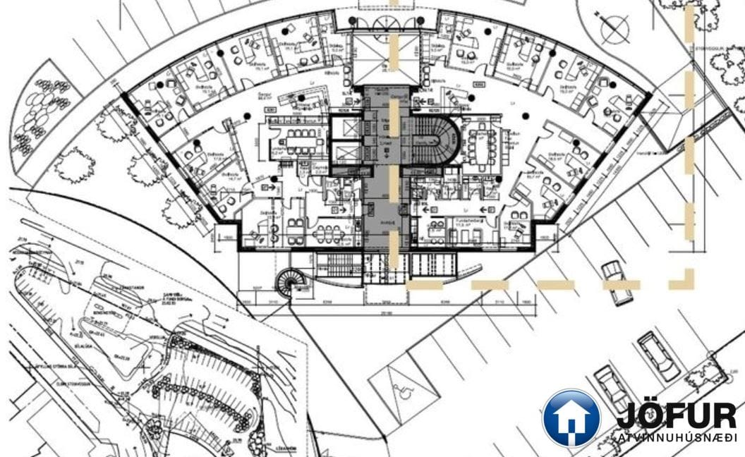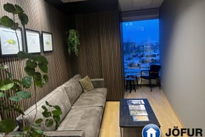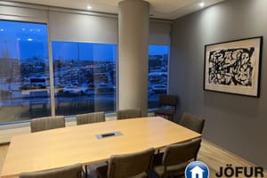 Nánari lýsing: Húsnæðið skiptist upp í móttöku, 6-7 lokaðar skrifstofur, fundaherbergi, kaffistofu, 2 snyrtingar, önnur þeirra með sturtu. Á gólfum er parket. Kerfisloft og lýsing í loftum. Innréttingar rýmisins hafa verið endurnýjaðar. Gengið er beint inn á hæðina frá bílastæði bakatil. Bílakjallari er undir húsinu. VSK leggst ekki við leigufjárhæðina.