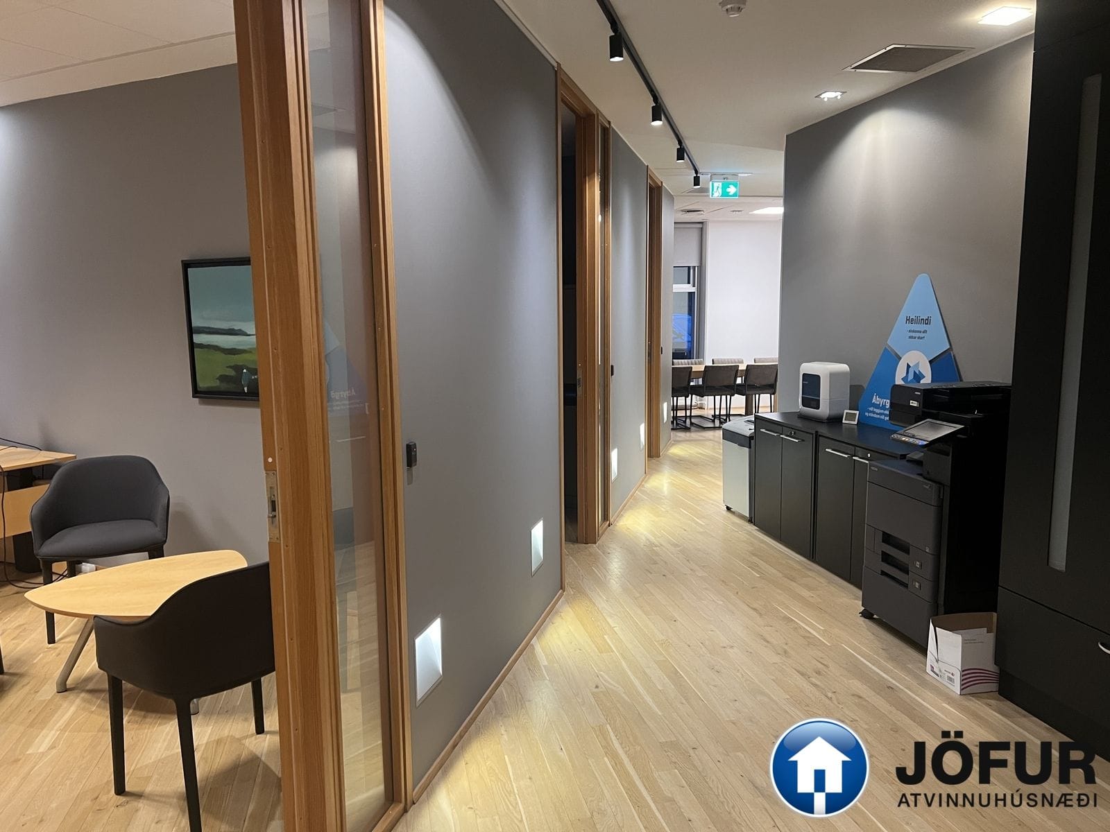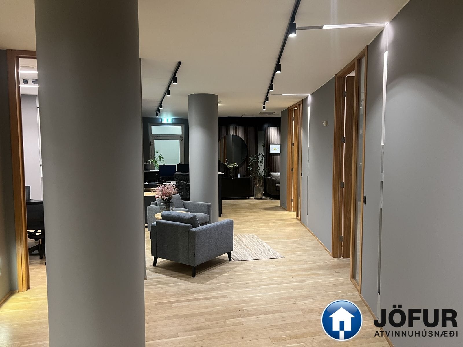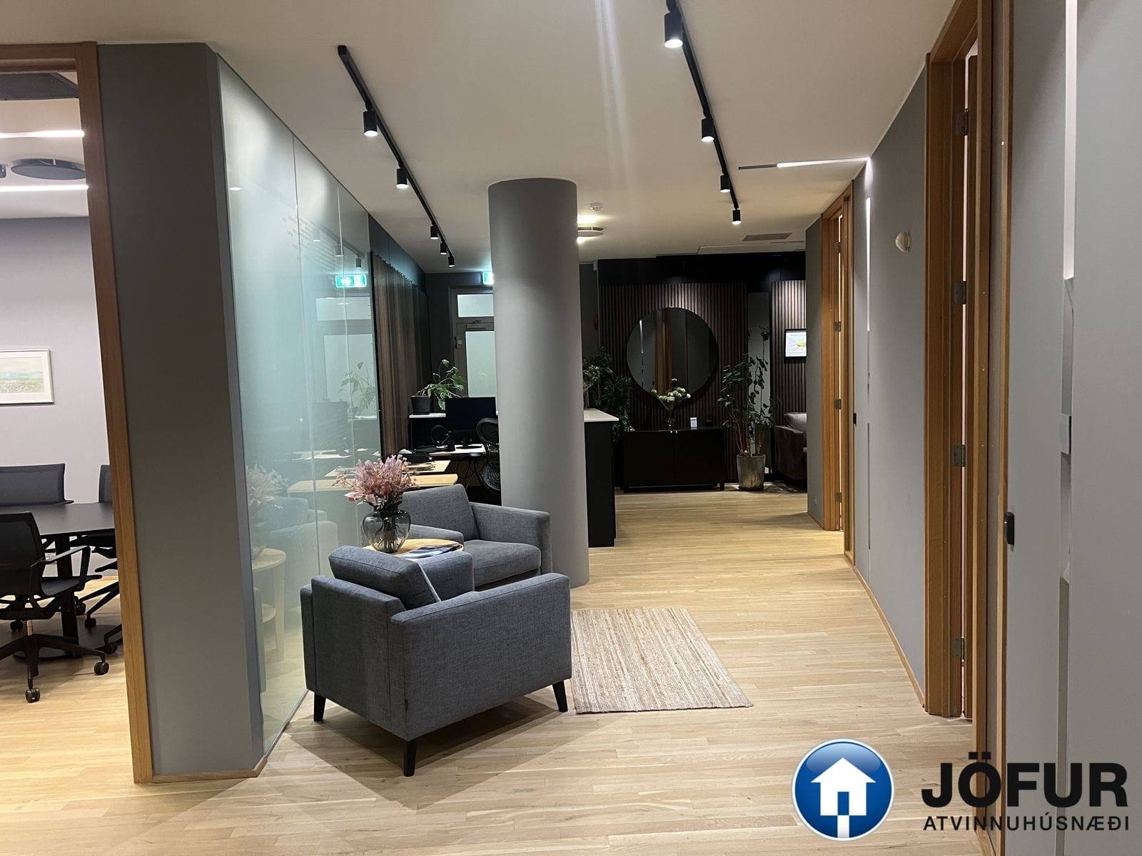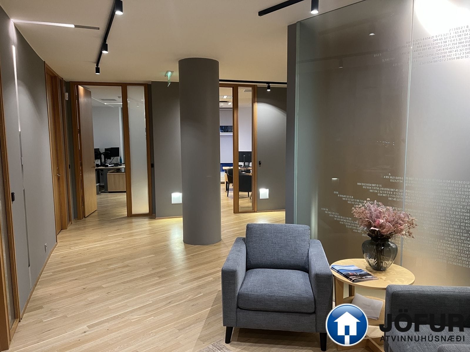Nánari lýsing: Húsnæðið skiptist upp í móttöku, 6-7 lokaðar skrifstofur, fundaherbergi, kaffistofu, 2 snyrtingar, önnur þeirra með sturtu. Á gólfum er parket. Kerfisloft og lýsing í loftum. Innréttingar rýmisins hafa verið endurnýjaðar. Gengið er beint inn á hæðina frá bílastæði bakatil. Bílakjallari er undir húsinu. VSK leggst ekki við leigufjárhæðina.