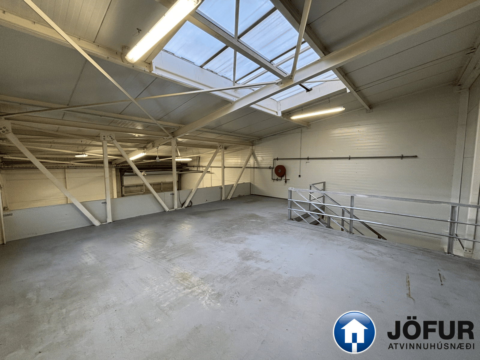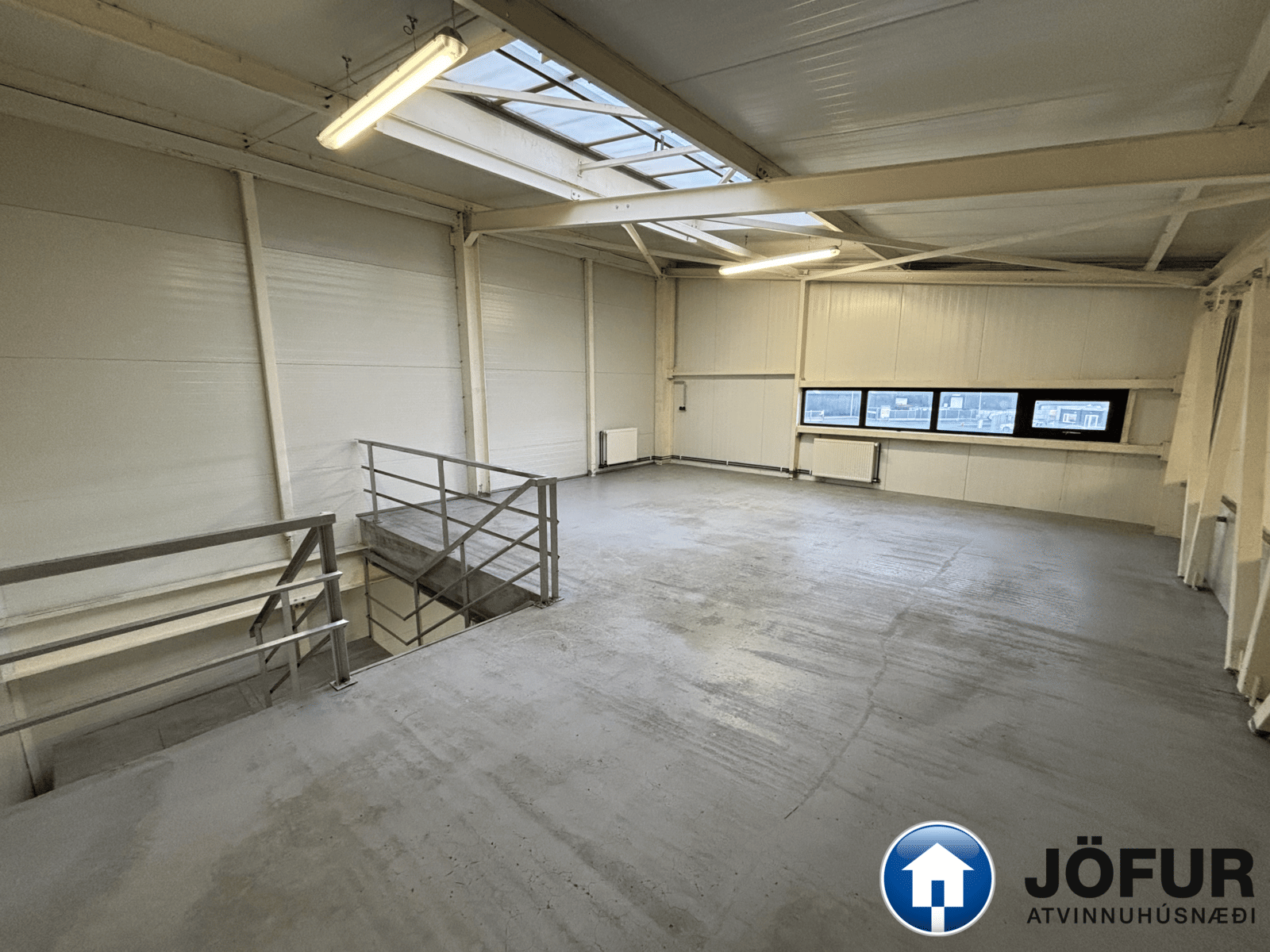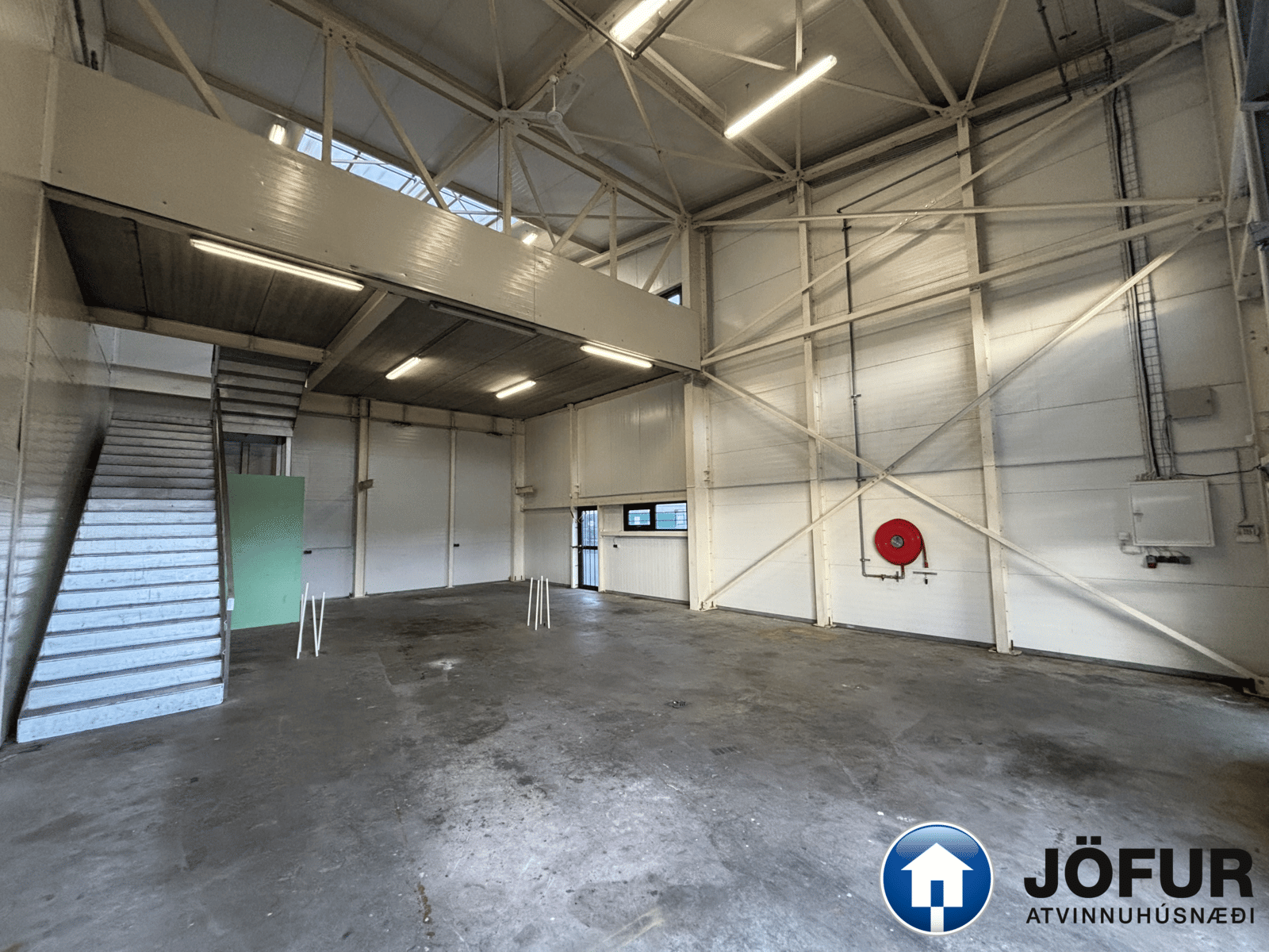 Eignin er stálgrindarhús sem skiptist í tvær hæðir. Jarðhæðin er 125,5 m² og er mest einn salur með inngöngudyrum á tvo vegu ásamt innkeyrsludyrum. Lofthæð við innkeyrsludyr er um 6,9 m. og innkeyrsludyrnar eru um 4,4 m. á hæð. Lofthæð undir millilofti er um 4,7 m. Niðurföll eru í gólfi og salernisaðstaða er á jarðhæð. 7 metrar inn að millilofti frá innkeyrsludyrum. Milliloftið er steypt, skráð 47,8 m², og er opið rými með þakgluggum og opnanlegum glugga. Þar eru einnig tveir miðstöðvarofnar. Brunaslönguhjól eru til staðar á báðum hæðum.Hitablásari er í sal. Malbikað bílaplan er við húsið. Ekki er til staðar vsk-kvöð á húsnæðinu. Eignin er laus við kaupsamning. Lyklar á skrifstofu Jöfurs, hafið samband til að skoða eignina.