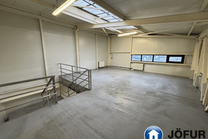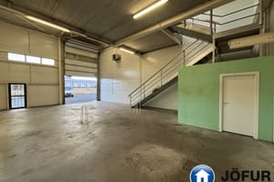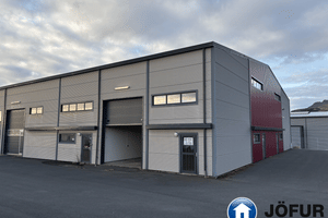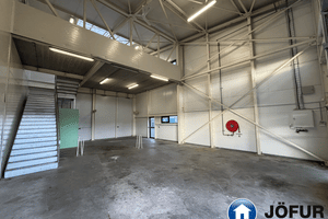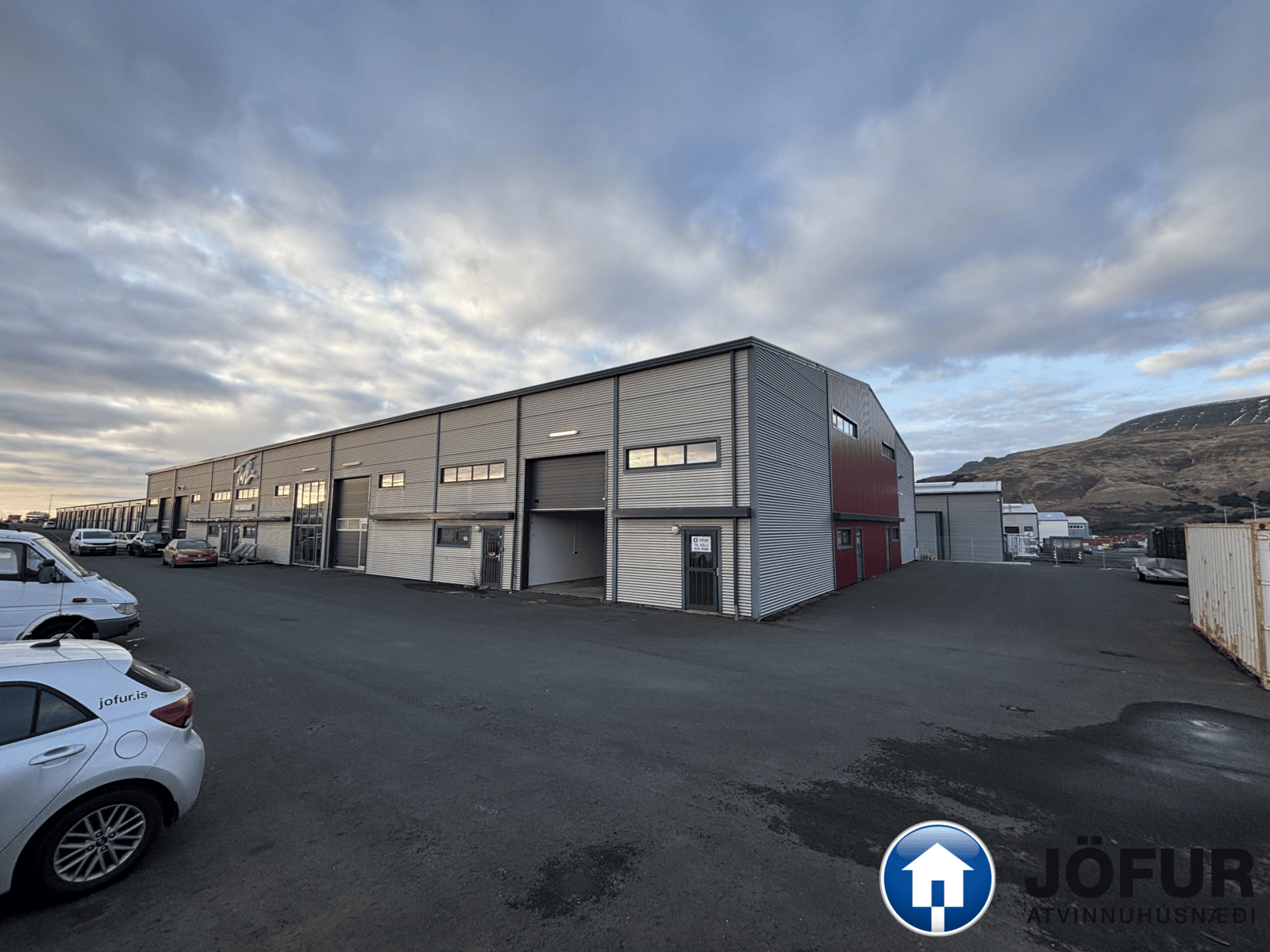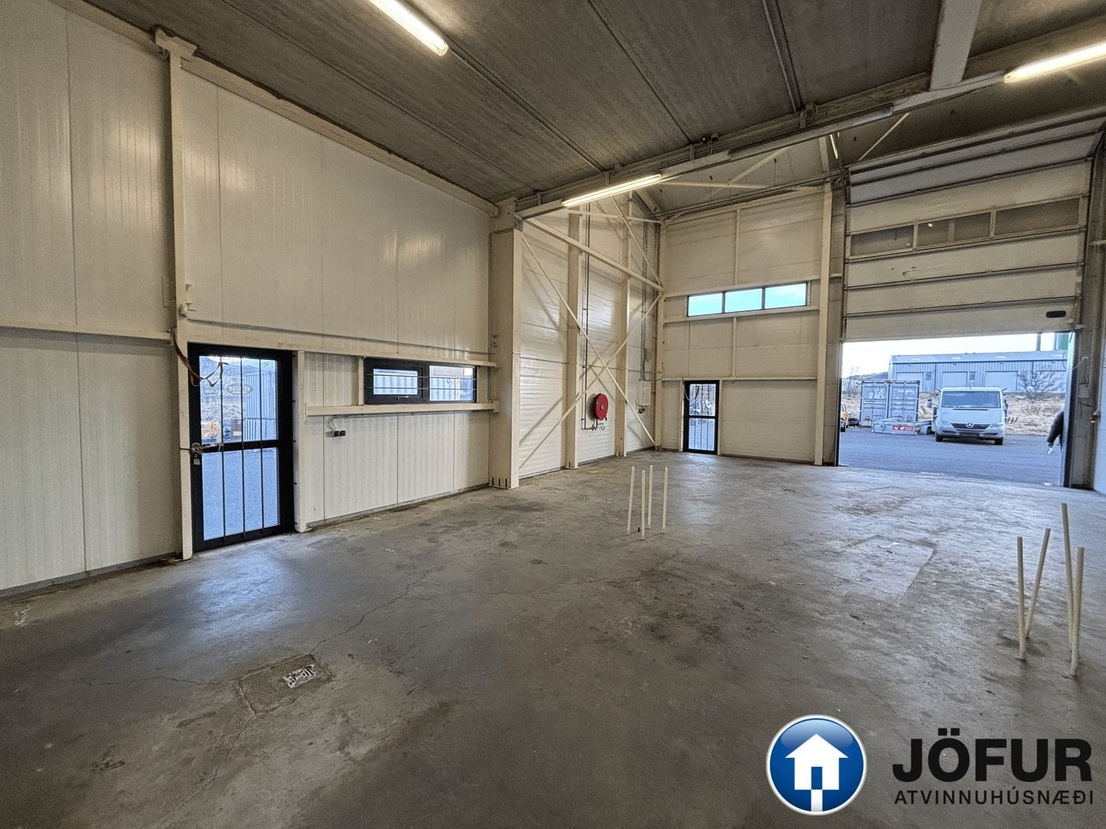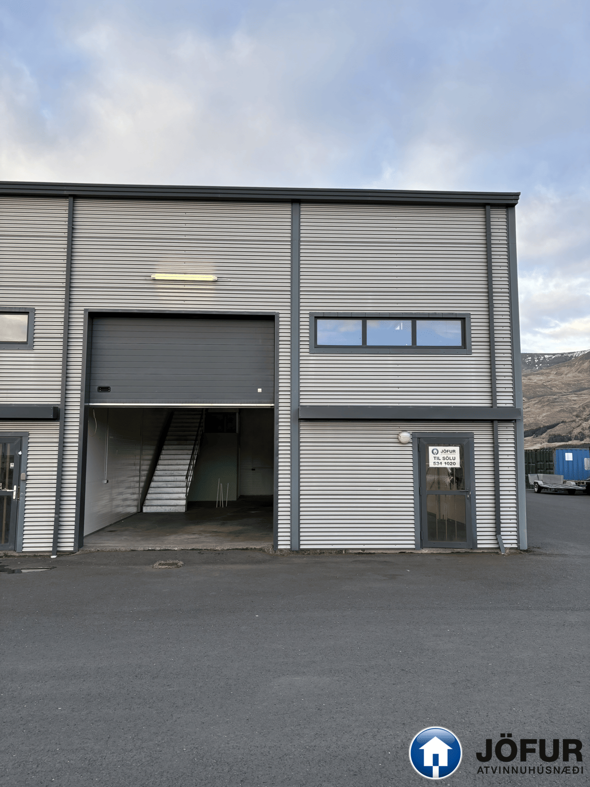 Eignin er stálgrindarhús sem skiptist í tvær hæðir. Jarðhæðin er 125,5 m² og er mest einn salur með inngöngudyrum á tvo vegu ásamt innkeyrsludyrum. Lofthæð við innkeyrsludyr er um 6,9 m. og innkeyrsludyrnar eru um 4,4 m. á hæð. Lofthæð undir millilofti er um 4,7 m. Niðurföll eru í gólfi og salernisaðstaða er á jarðhæð. 7 metrar inn að millilofti frá innkeyrsludyrum. Milliloftið er steypt, skráð 47,8 m², og er opið rými með þakgluggum og opnanlegum glugga. Þar eru einnig tveir miðstöðvarofnar. Brunaslönguhjól eru til staðar á báðum hæðum.Hitablásari er í sal. Malbikað bílaplan er við húsið. Ekki er til staðar vsk-kvöð á húsnæðinu. Eignin er laus við kaupsamning. Lyklar á skrifstofu Jöfurs, hafið samband til að skoða eignina.