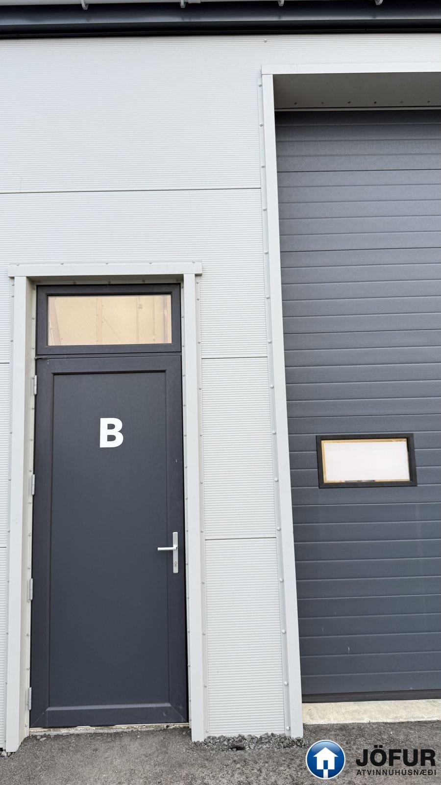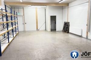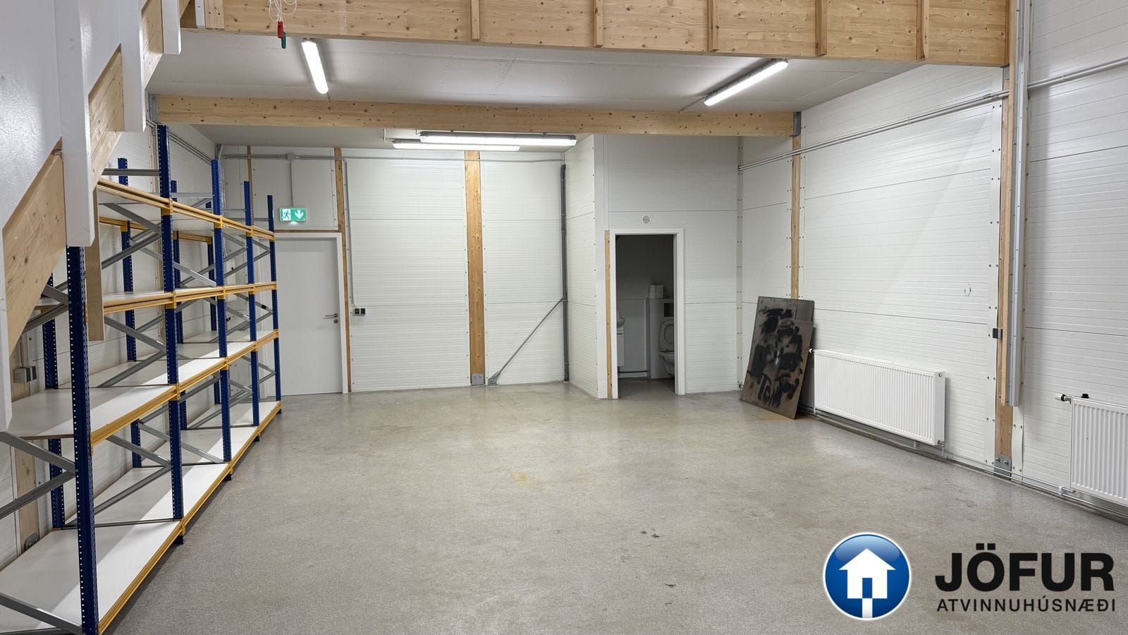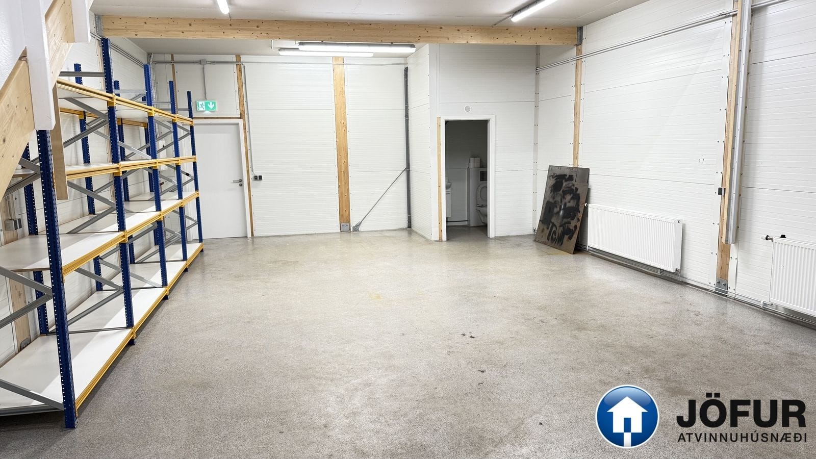 Stór innkeyrsluhurð og inngönguhurð er á rýminu. Mikil lofthæð. Málað gólf. Salerni er á neðri hæð.