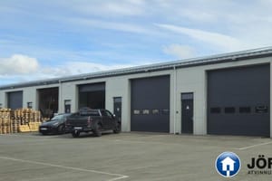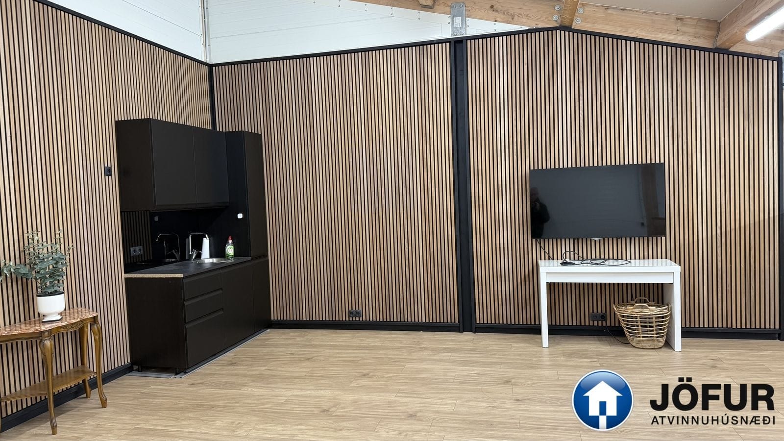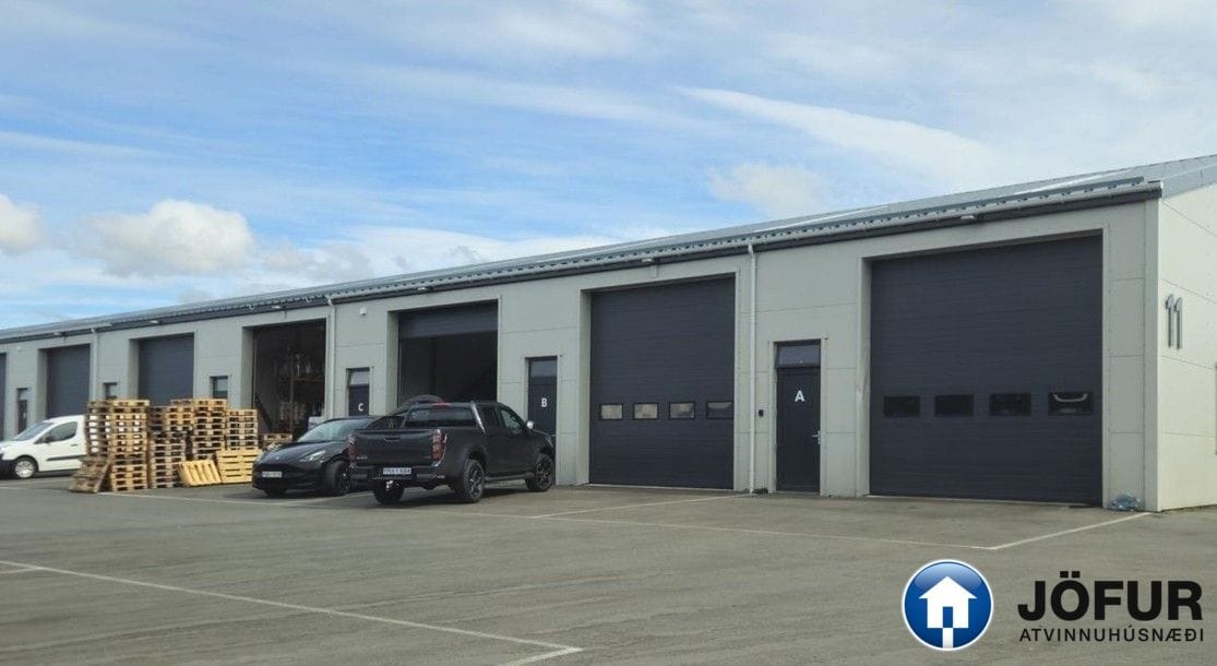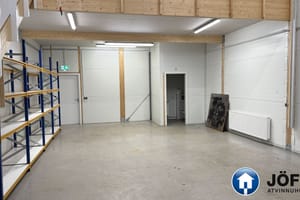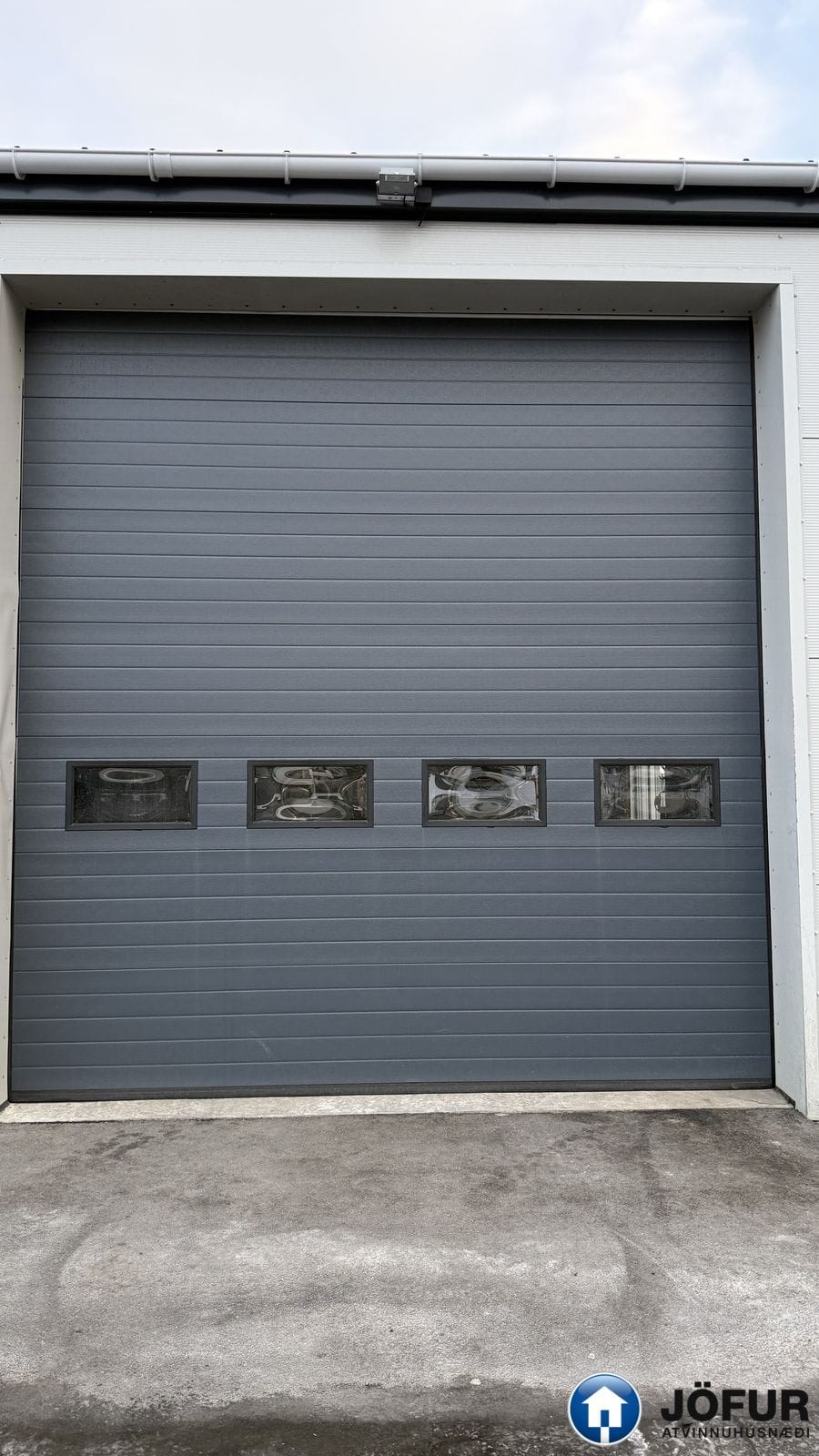 Stór innkeyrsluhurð og inngönguhurð er á rýminu. Mikil lofthæð. Málað gólf. Salerni er á neðri hæð.