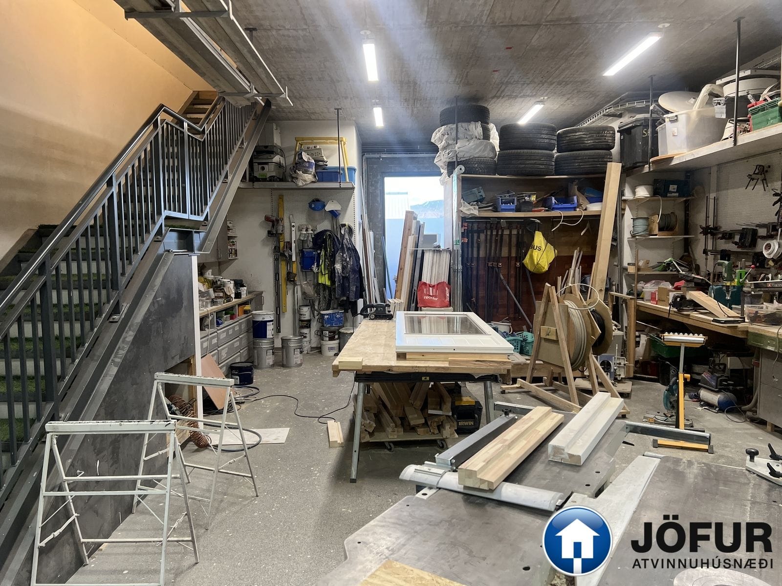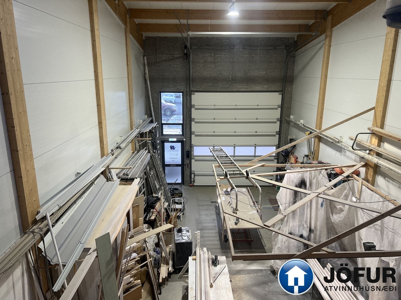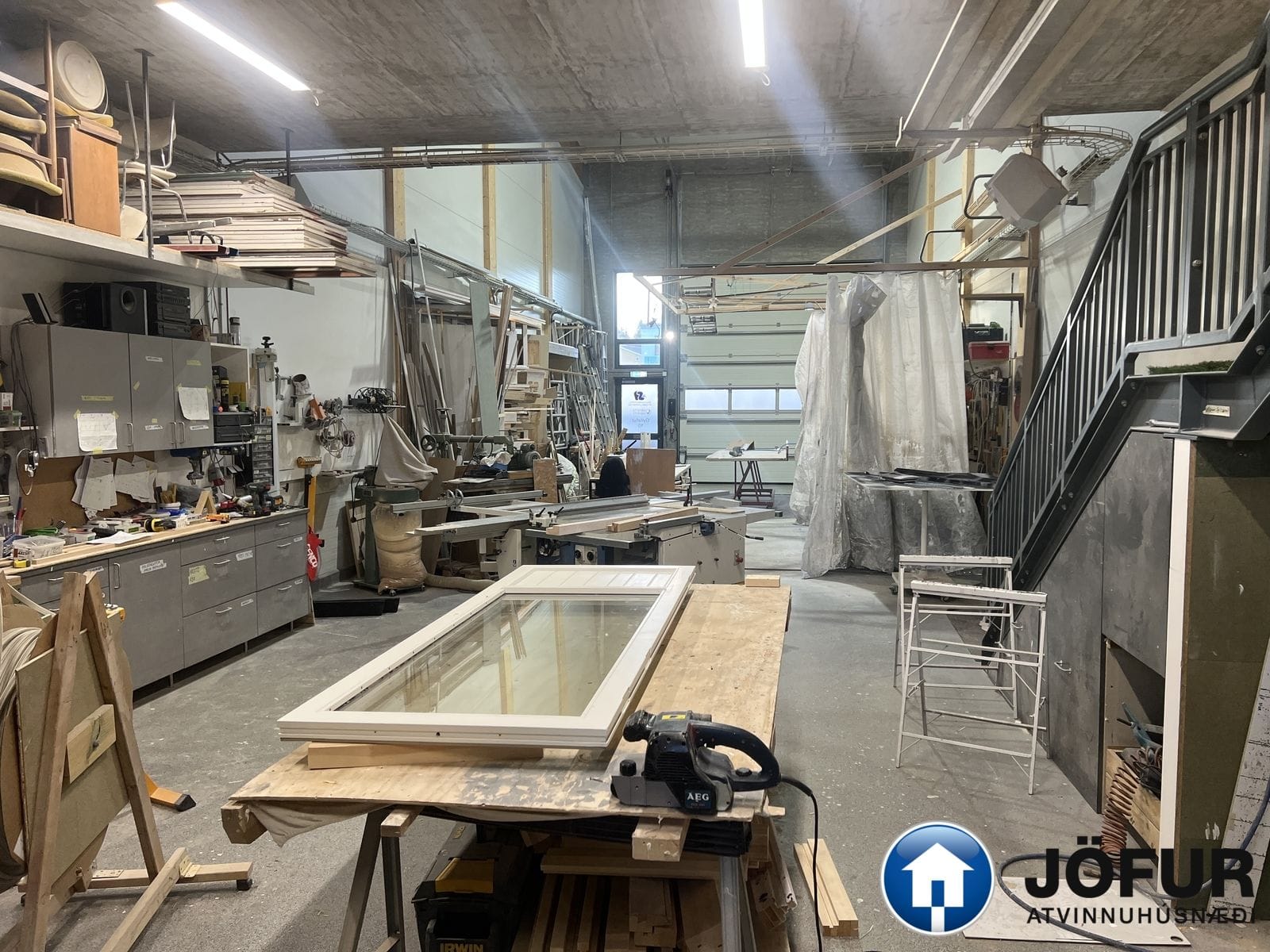 Lofthæð er mikil, allt að 8 metrum þar sem hæst er í sal. Milliloft er steypt á því er ein lokuð skrifstofa og alrými með eldhússinnréttingu. Gólfefni í sal er epoxy, en parket á milligólfi. Jarðhæð er 153,9 m², lofthæð er ca. 3,5 metrar á 63,8 fm. hluta en 7-8 metrar á 90,1 fm. hluta. 2. hæð er 58,1 m². Lofthæð er 3-4 metrar á hæðinni. Innkeyrsludyr eru rafdrifnar 4,5 m. á hæð. VSK kvöð er á húsnæðinu og skal kaupandi yfirtaka hana við kaupsamning.