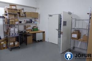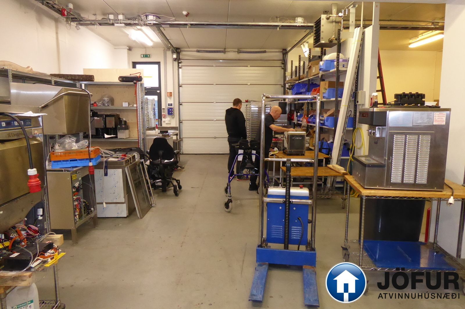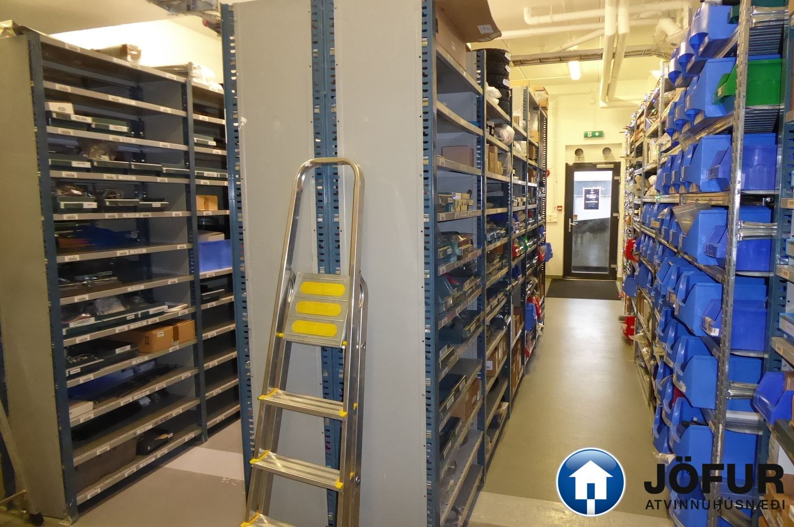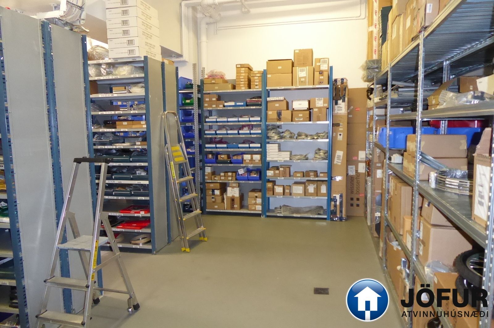 Skiptist upp í tvö aðskilin rými með millivegg og snyrtingar. 3ja fasa rafmagn er til staðar. Lofthæð er frá 3,2 - 3,6 m. en er lægri undir bitum, (um 2,7 m.). Hæð á innkeyrsluhurð er um 3 m. Niðurföll eru í gólfi. VSK leggst við leigufjárhæðina.