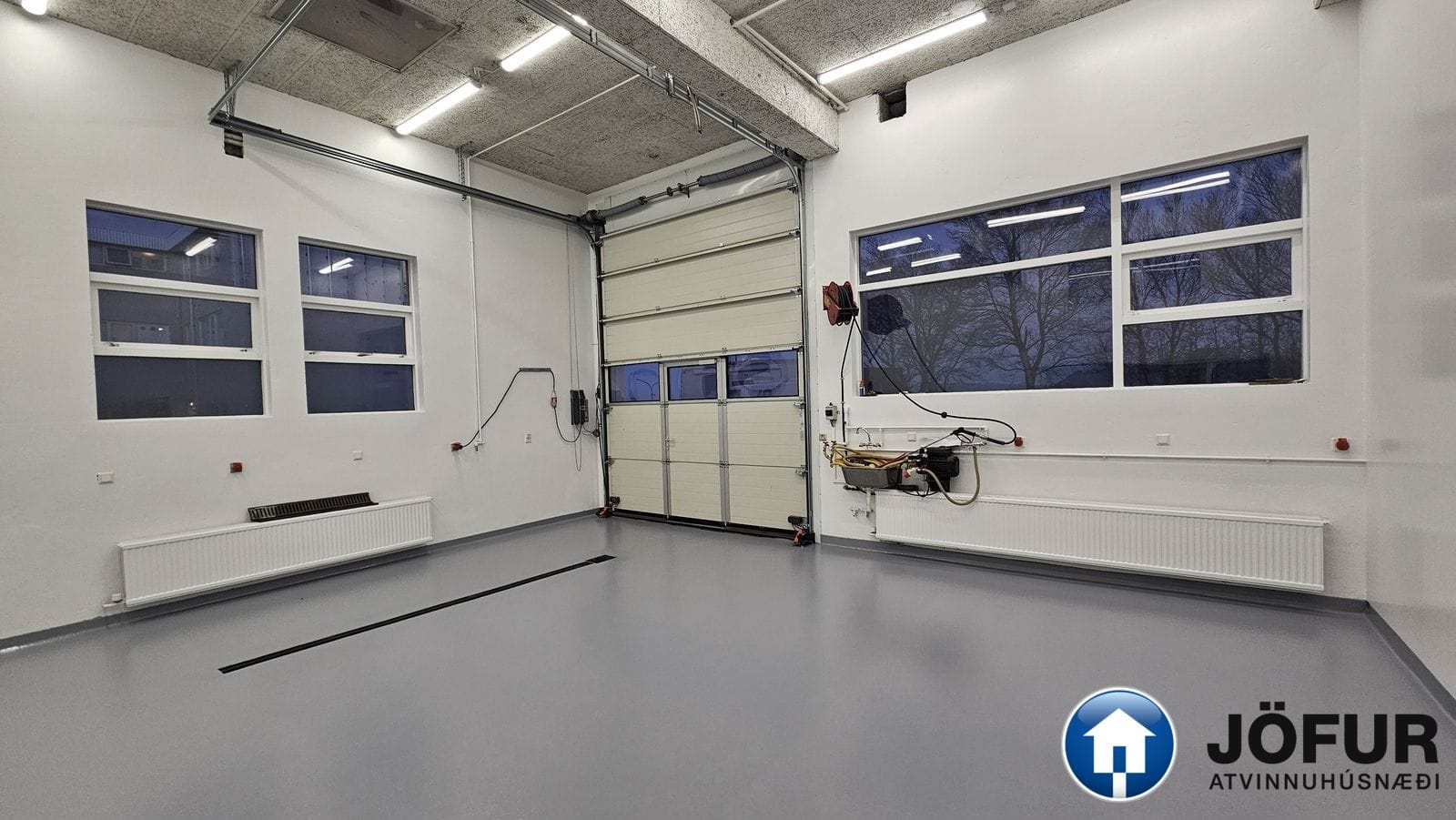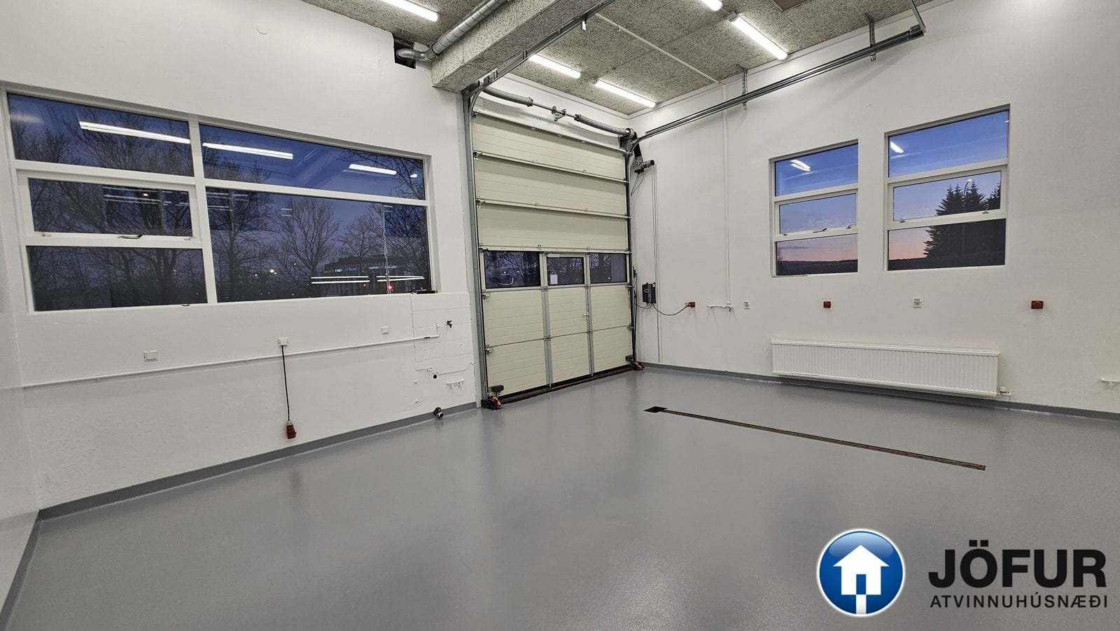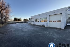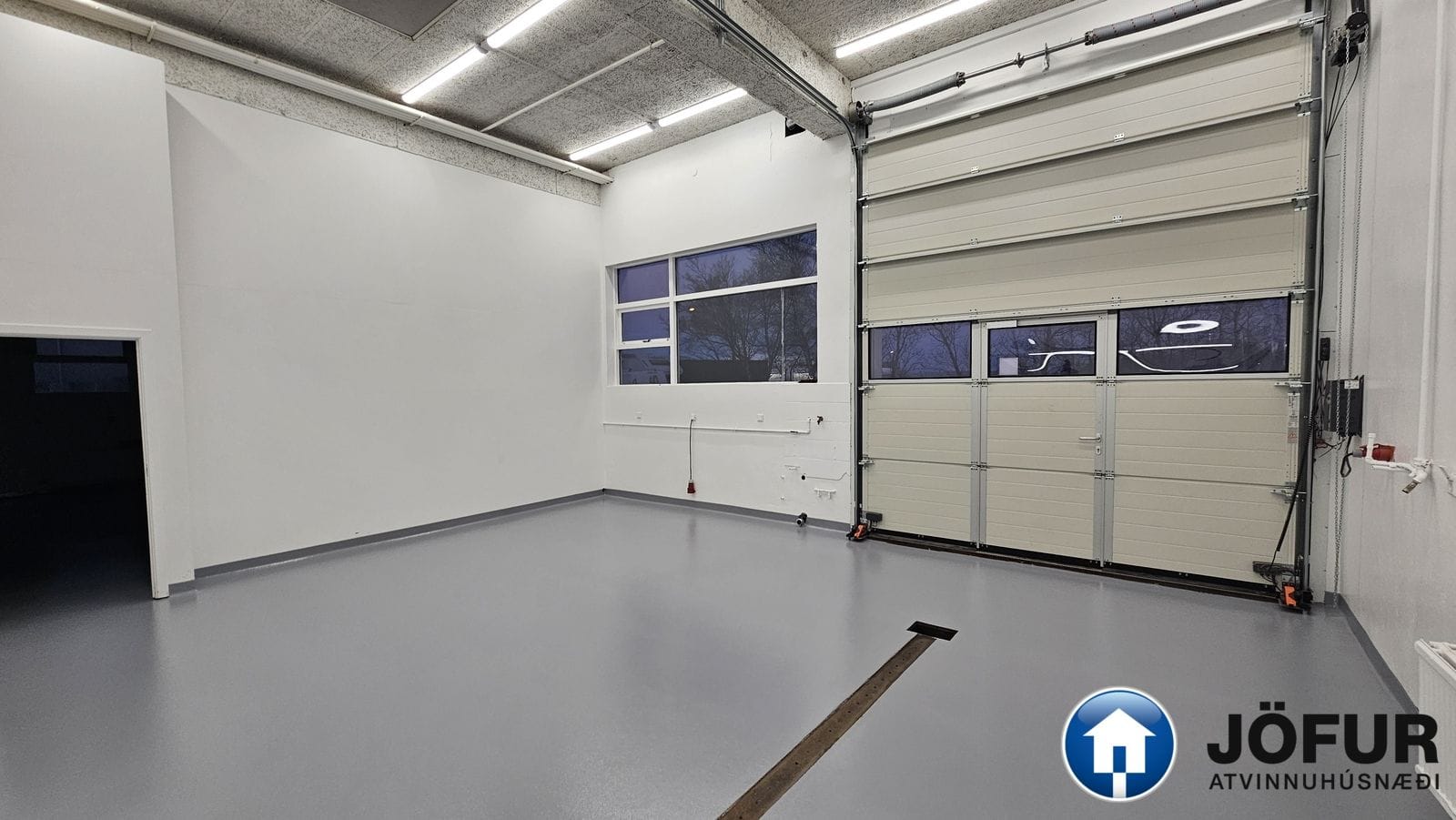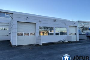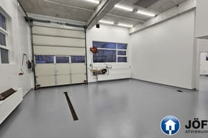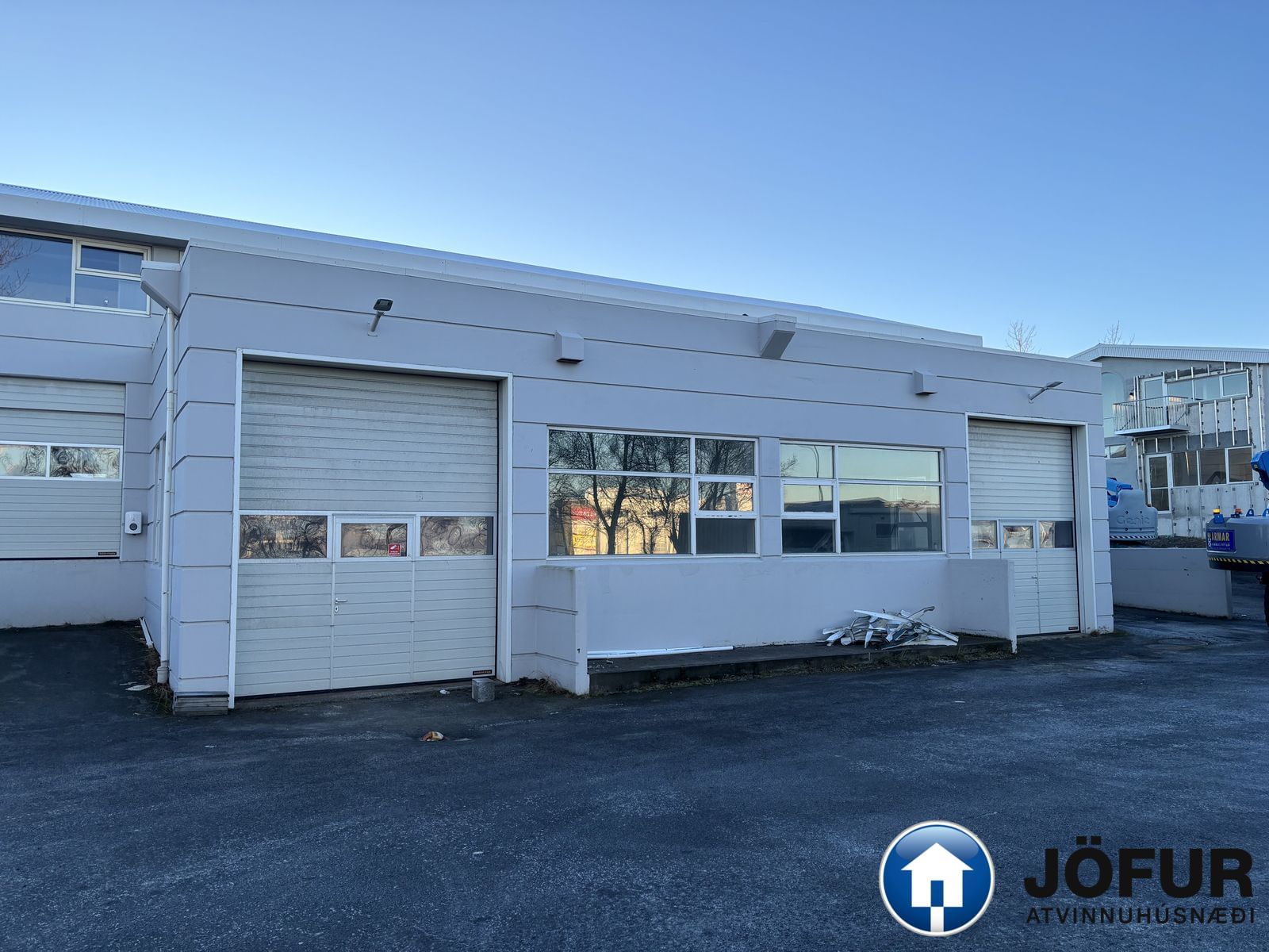 Tvær stórar innkeyrsludyr eru á húsnæðinu (3,9 m.) með inngöngudyrum. Góð lofthæð (4,6 m.). Húsnæðið samanstendur af tveimur opnum vinnurýmum sem opið er á milli. Á millilofti sem er um 26 m² er kaffistofa, salerni og lokað rými sem væri hægt að nýta sem skrifstofu. Húsnæðið gæti hentað vel t.d. fyrir heildverslun eða verktaka. Gott malbikað bílaplan er við húsið. Ekki vsk húsnæði.