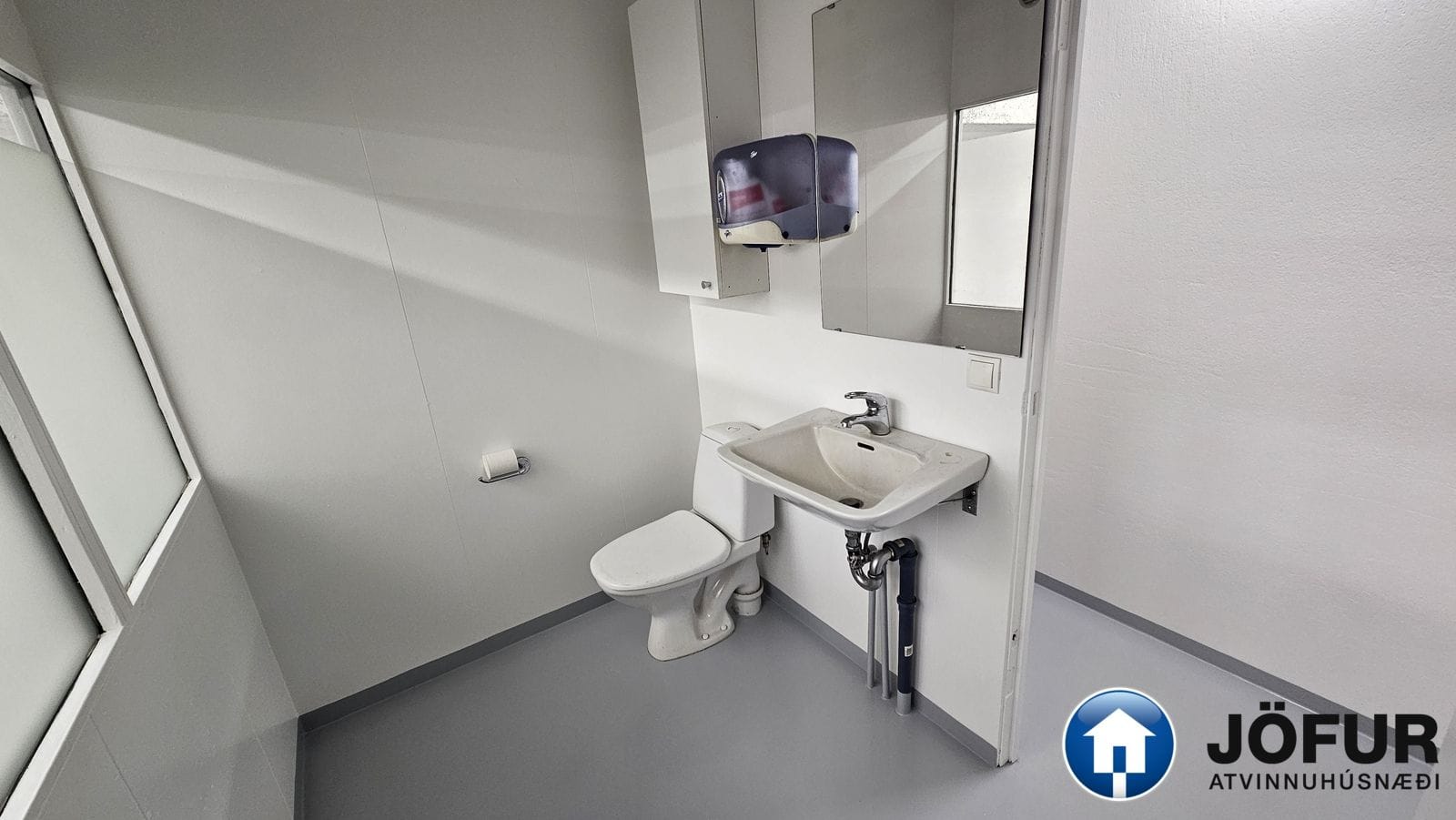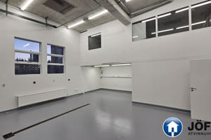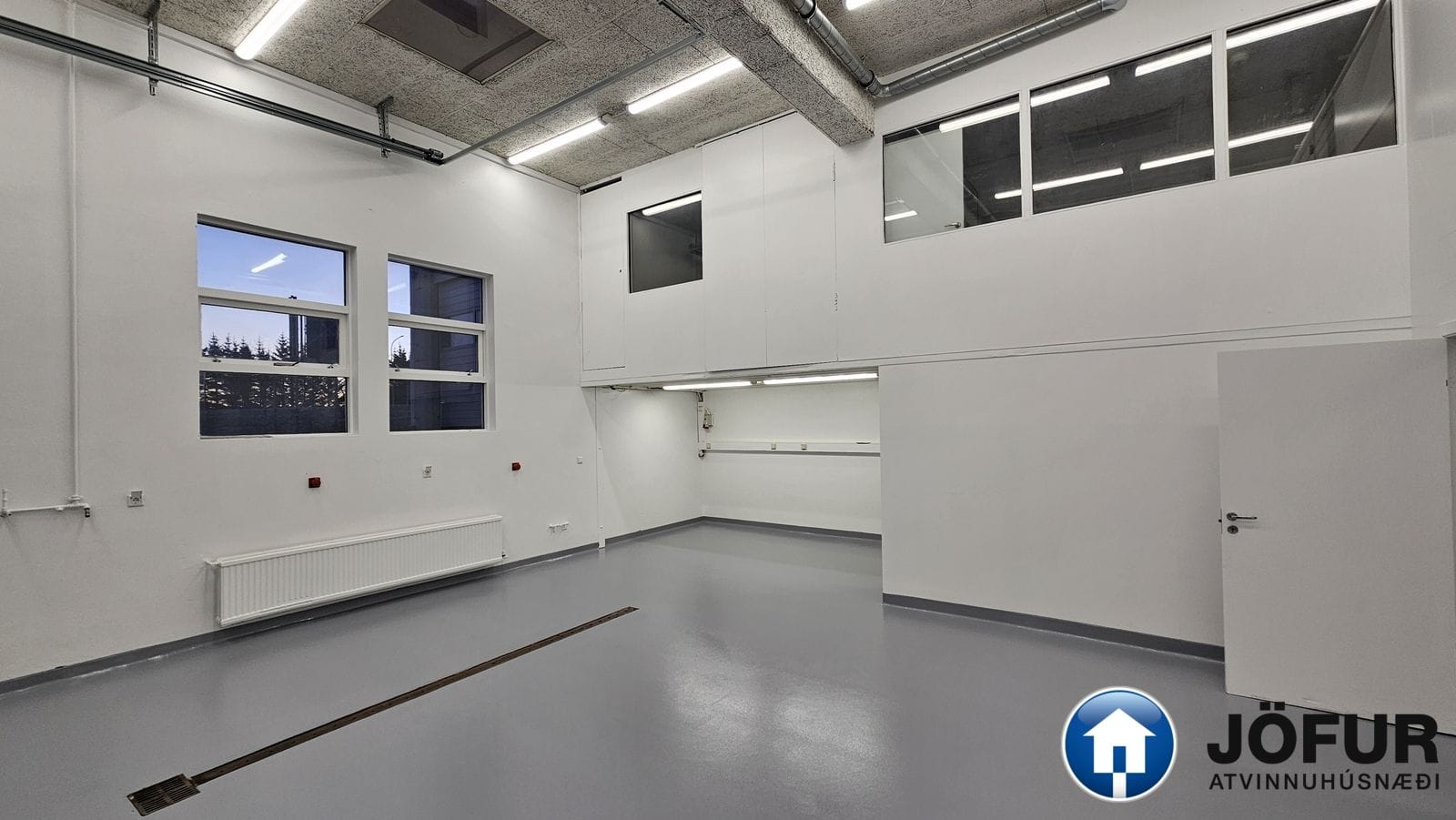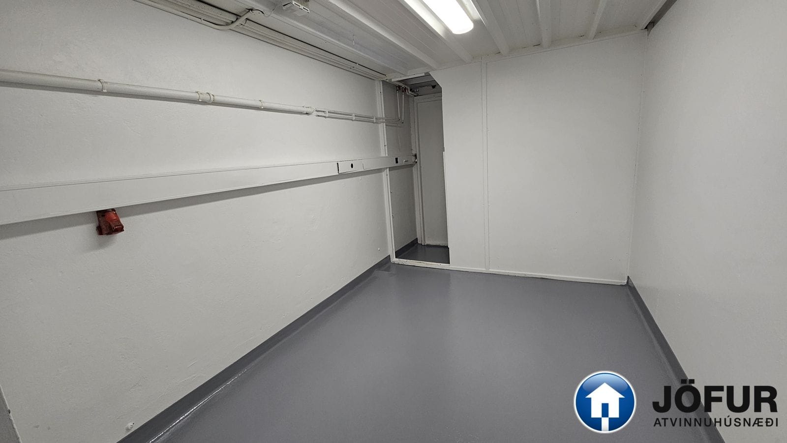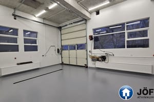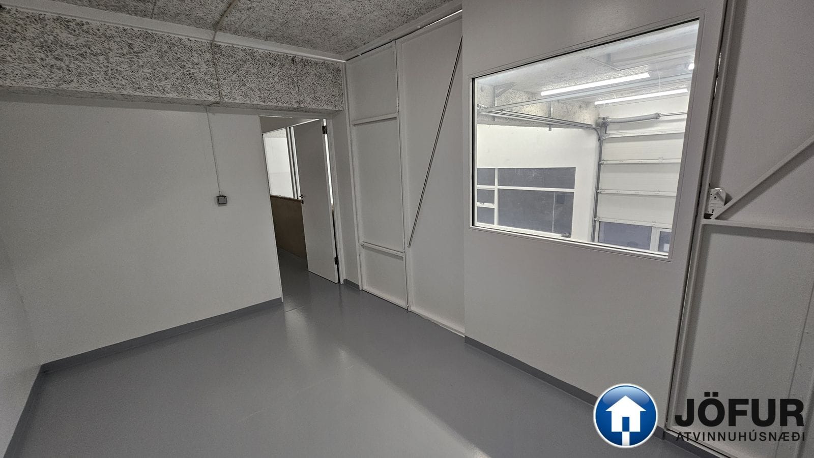 Tvær stórar innkeyrsludyr eru á húsnæðinu (3,9 m.) með inngöngudyrum. Góð lofthæð (4,6 m.). Húsnæðið samanstendur af tveimur opnum vinnurýmum sem opið er á milli. Á millilofti sem er um 26 m² er kaffistofa, salerni og lokað rými sem væri hægt að nýta sem skrifstofu. Húsnæðið gæti hentað vel t.d. fyrir heildverslun eða verktaka. Gott malbikað bílaplan er við húsið. Ekki vsk húsnæði.